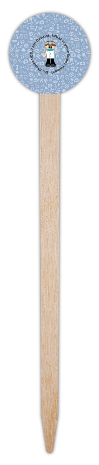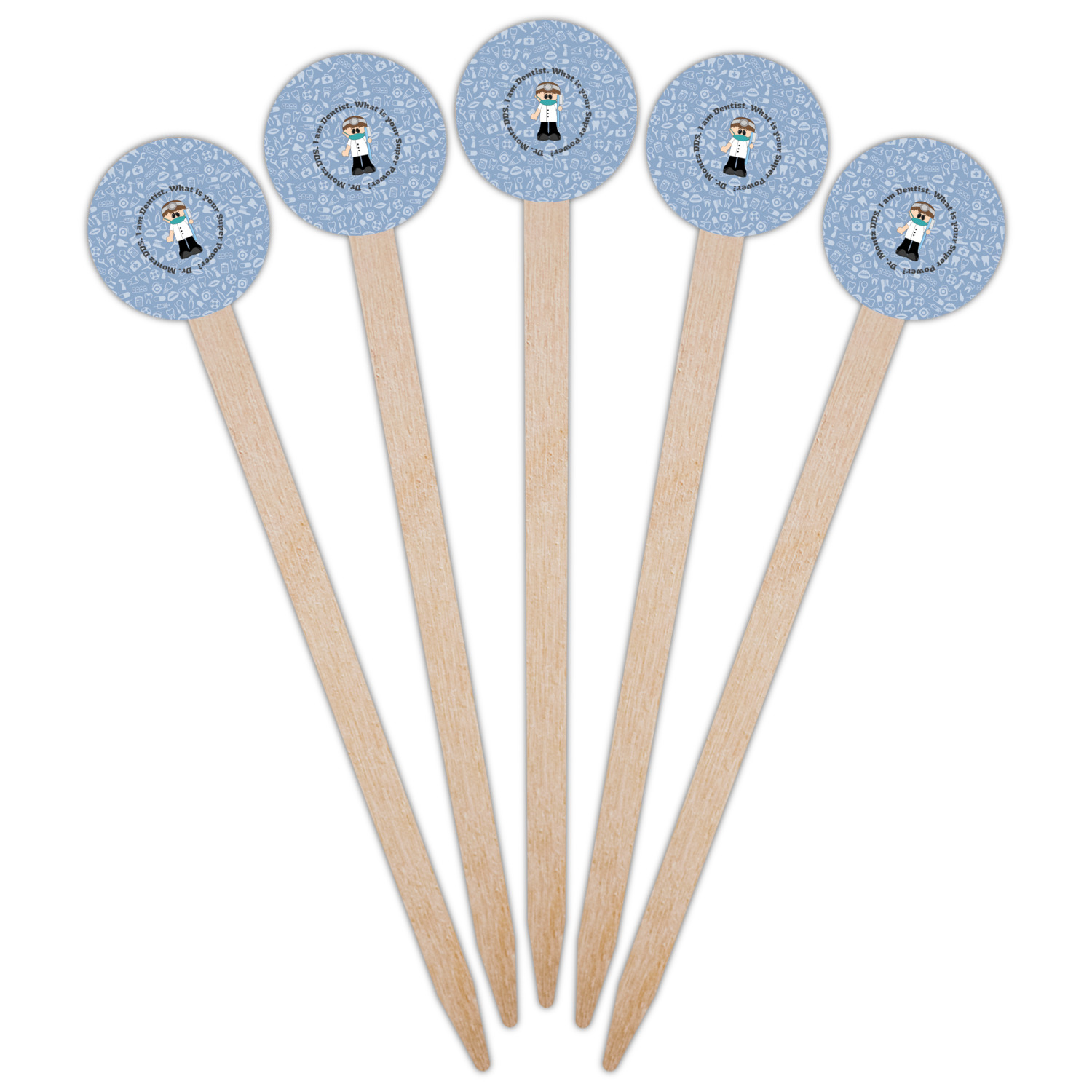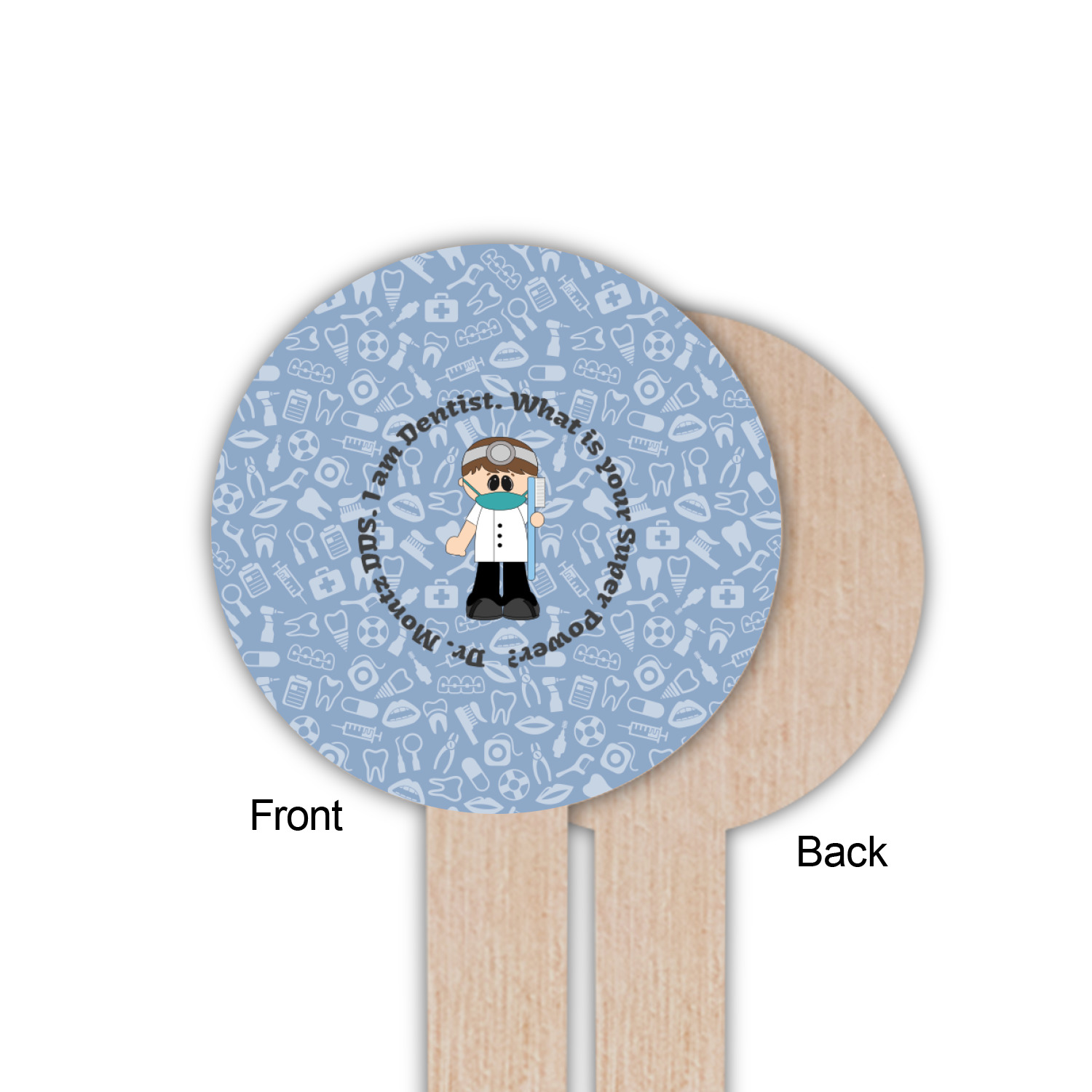 This design is a light blue with dark blue accents in its background. The design features a fun little cartoon dentist that will just make you smile. The text surrounding the little dentist will be the perfect place for a dentist pun or your name!