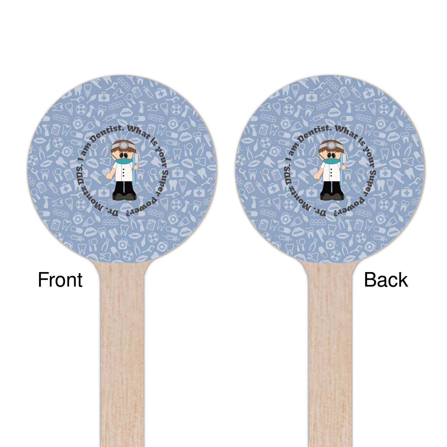 This design is a light blue with dark blue accents in its background. The design features a fun little cartoon dentist that will just make you smile. The text surrounding the little dentist will be the perfect place for a dentist pun or your name!