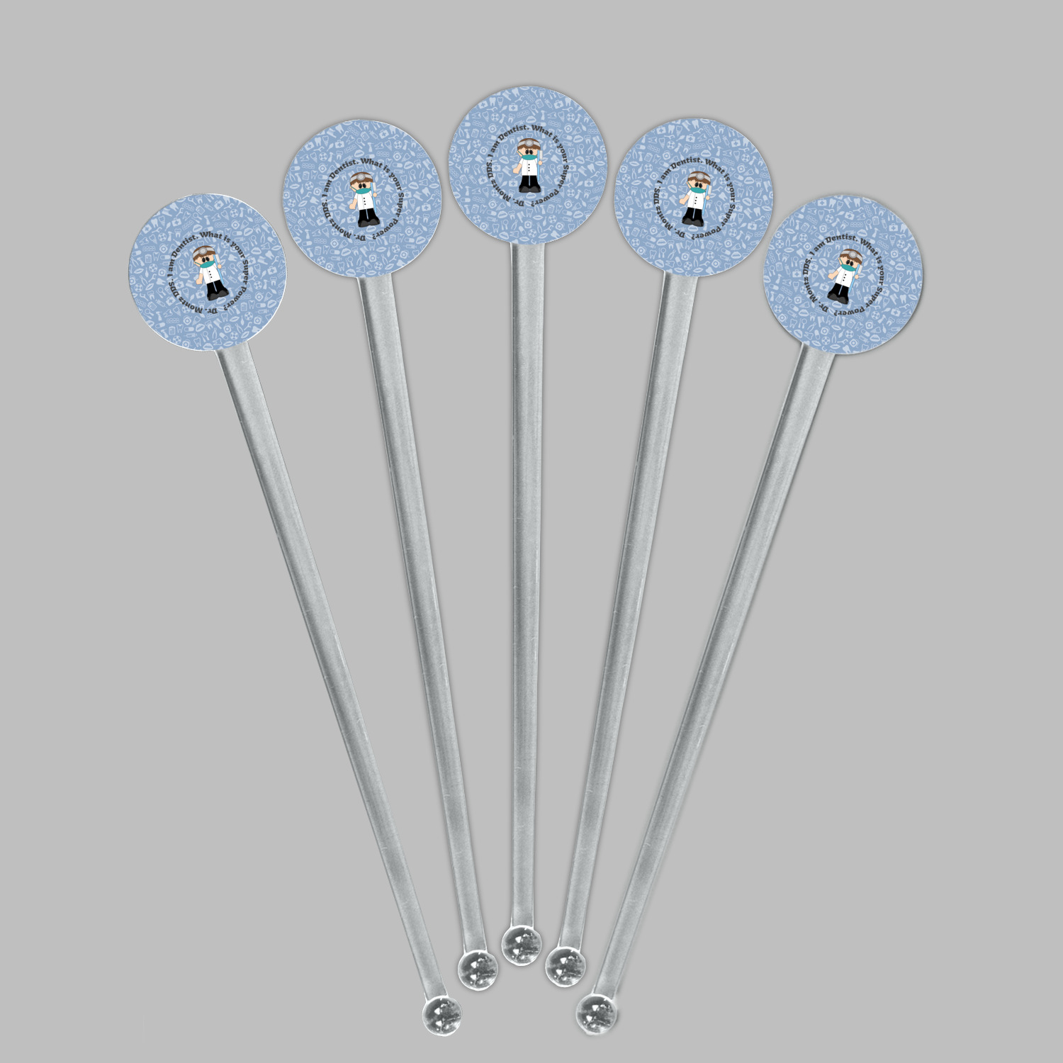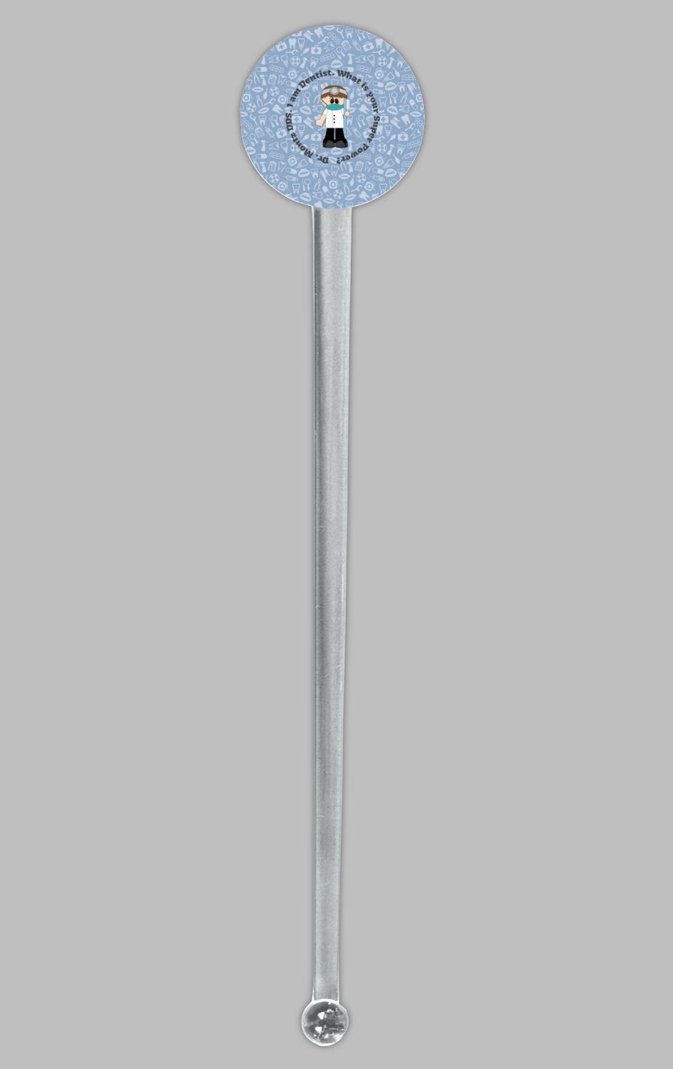 This design is a light blue with dark blue accents in its background. The design features a fun little cartoon dentist that will just make you smile. The text surrounding the little dentist will be the perfect place for a dentist pun or your name!