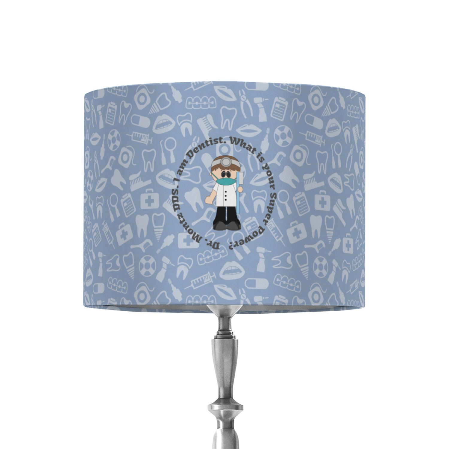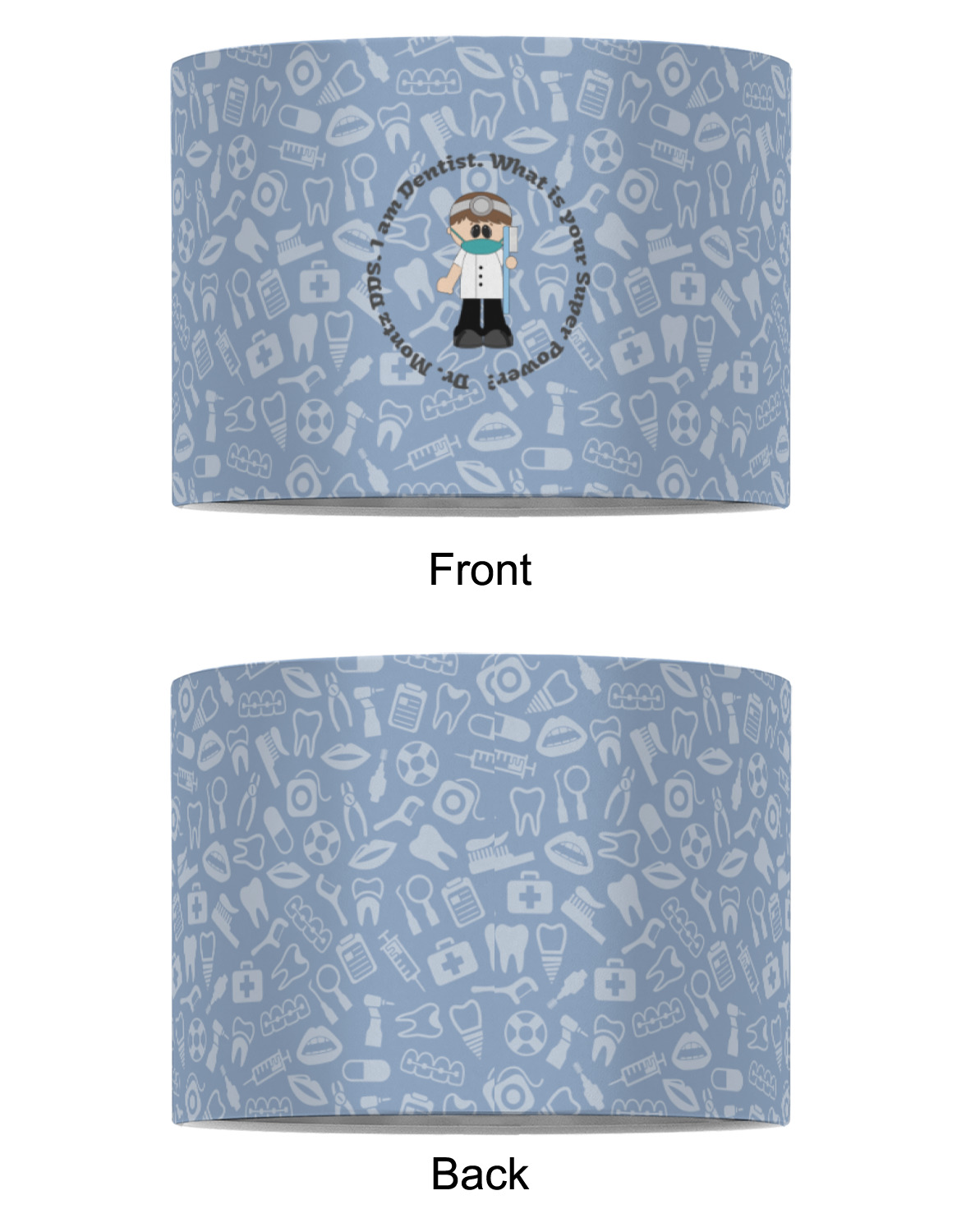 This design is a light blue with dark blue accents in its background. The design features a fun little cartoon dentist that will just make you smile. The text surrounding the little dentist will be the perfect place for a dentist pun or your name!