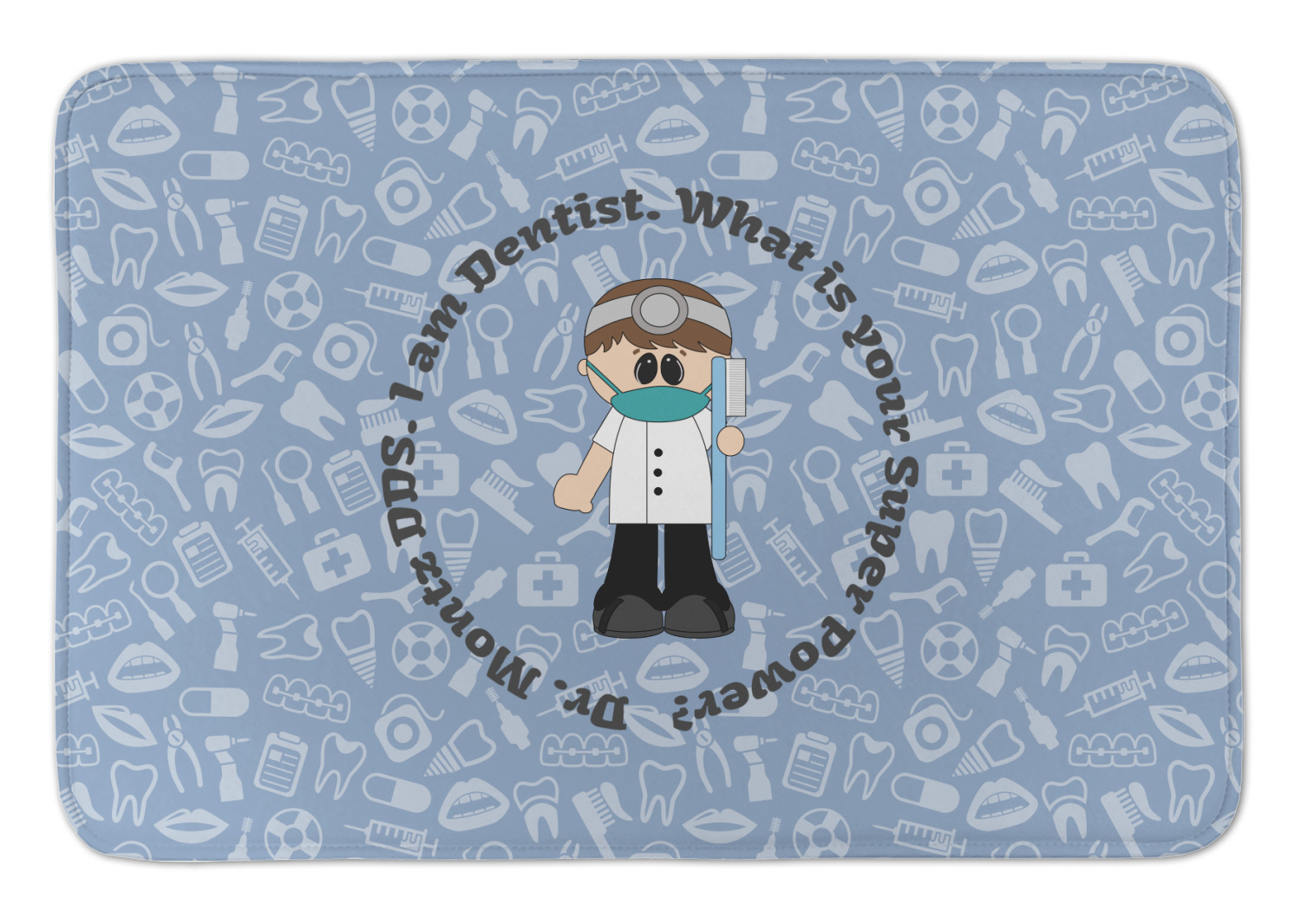 This design is a light blue with dark blue accents in its background. The design features a fun little cartoon dentist that will just make you smile. The text surrounding the little dentist will be the perfect place for a dentist pun or your name!