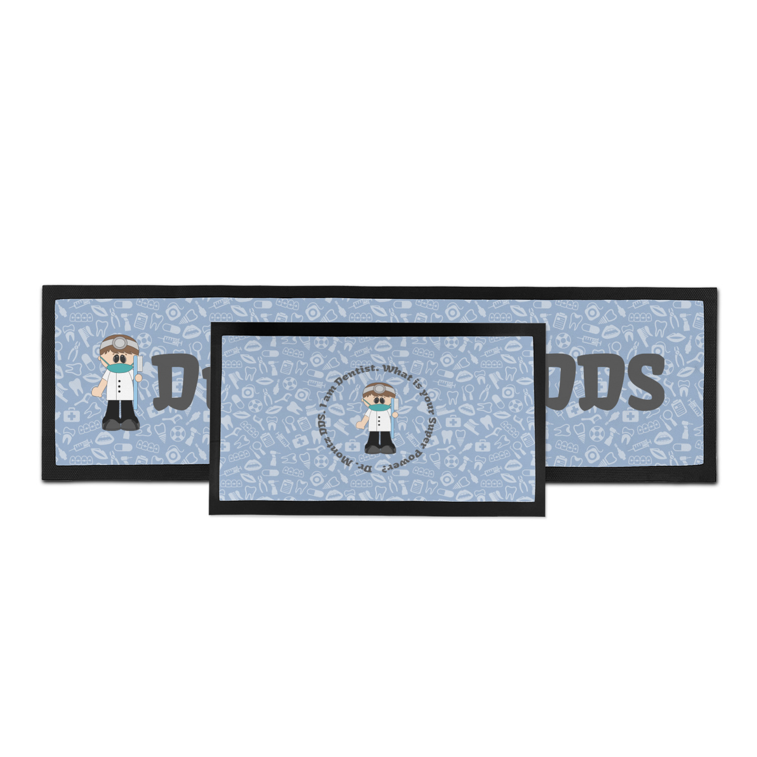 This design is a light blue with dark blue accents in its background. The design features a fun little cartoon dentist that will just make you smile. The text surrounding the little dentist will be the perfect place for a dentist pun or your name!