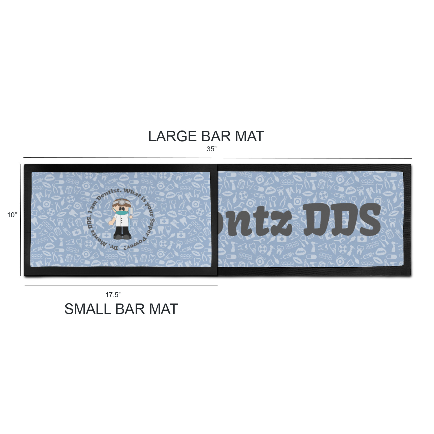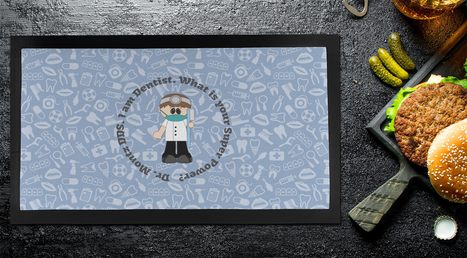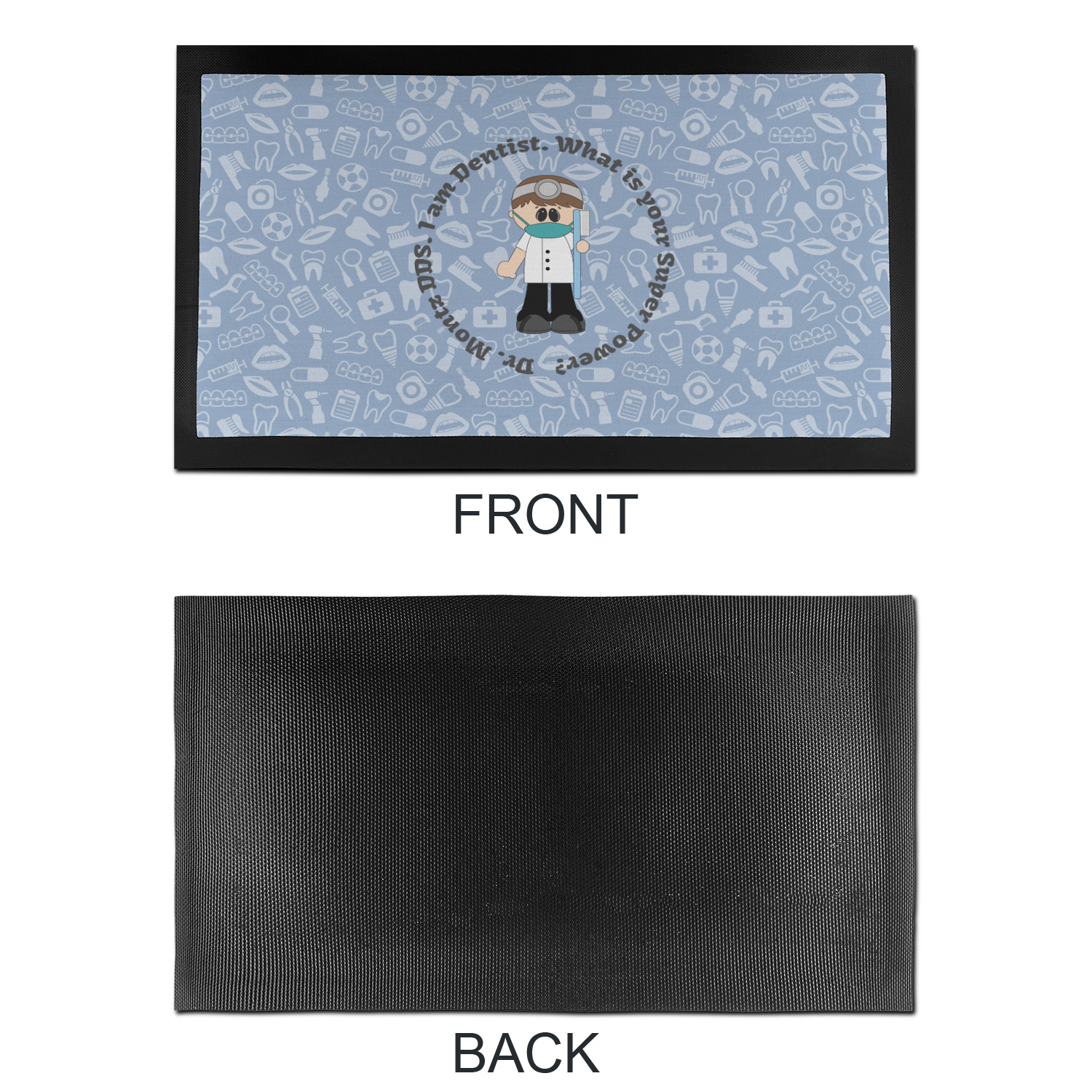 This design is a light blue with dark blue accents in its background. The design features a fun little cartoon dentist that will just make you smile. The text surrounding the little dentist will be the perfect place for a dentist pun or your name!