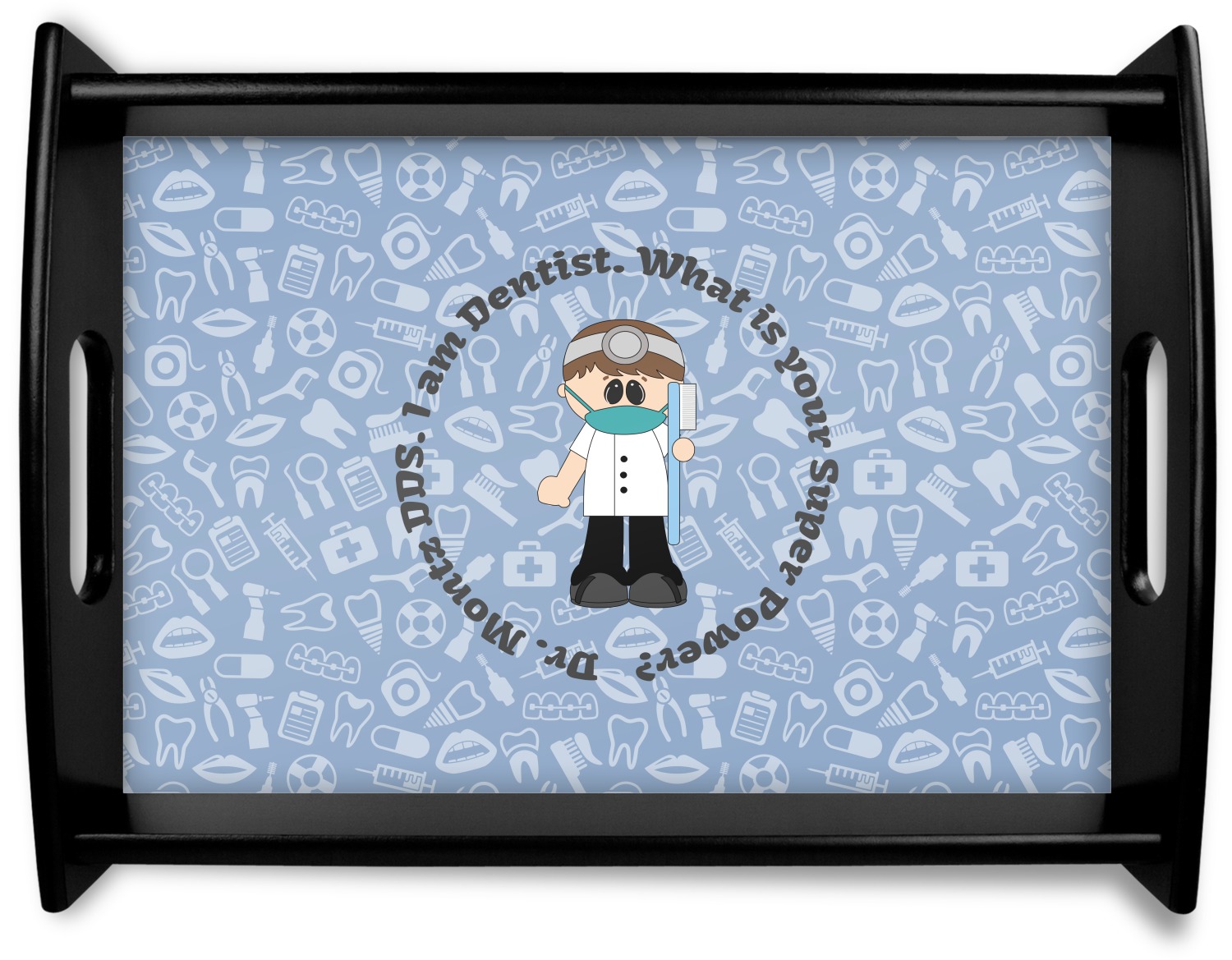 This design is a light blue with dark blue accents in its background. The design features a fun little cartoon dentist that will just make you smile. The text surrounding the little dentist will be the perfect place for a dentist pun or your name!