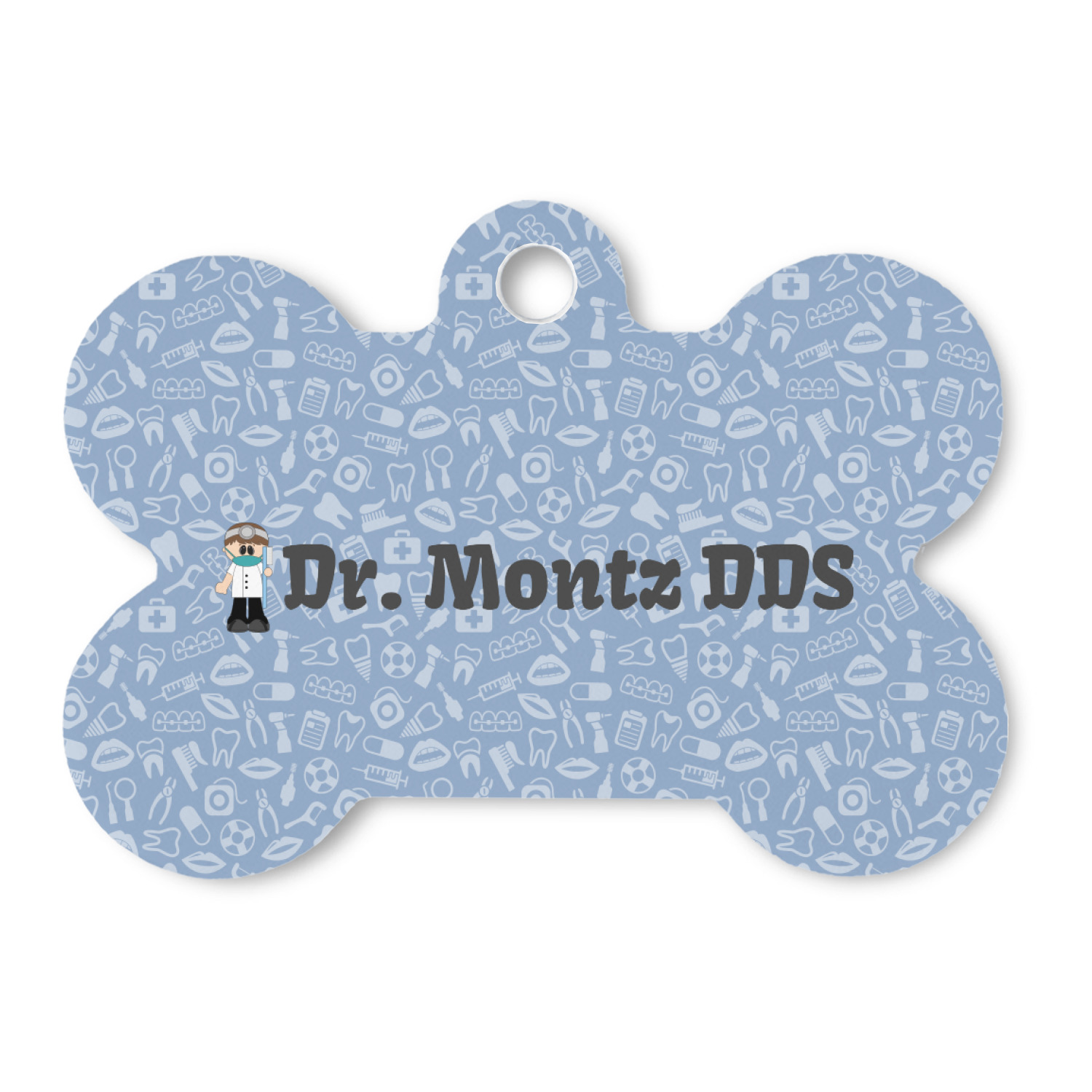 This design is a light blue with dark blue accents in its background. The design features a fun little cartoon dentist that will just make you smile. The text surrounding the little dentist will be the perfect place for a dentist pun or your name!