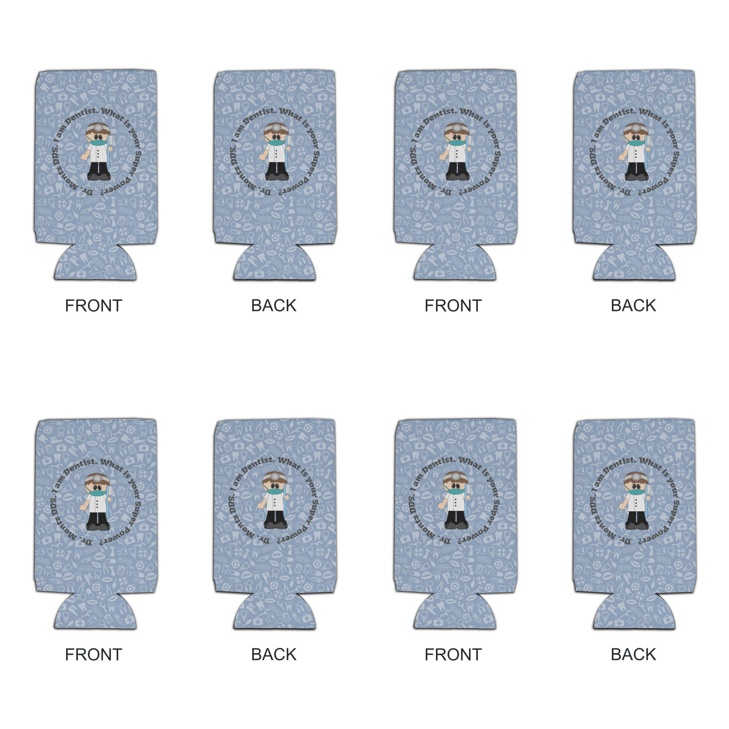 This design is a light blue with dark blue accents in its background. The design features a fun little cartoon dentist that will just make you smile. The text surrounding the little dentist will be the perfect place for a dentist pun or your name!