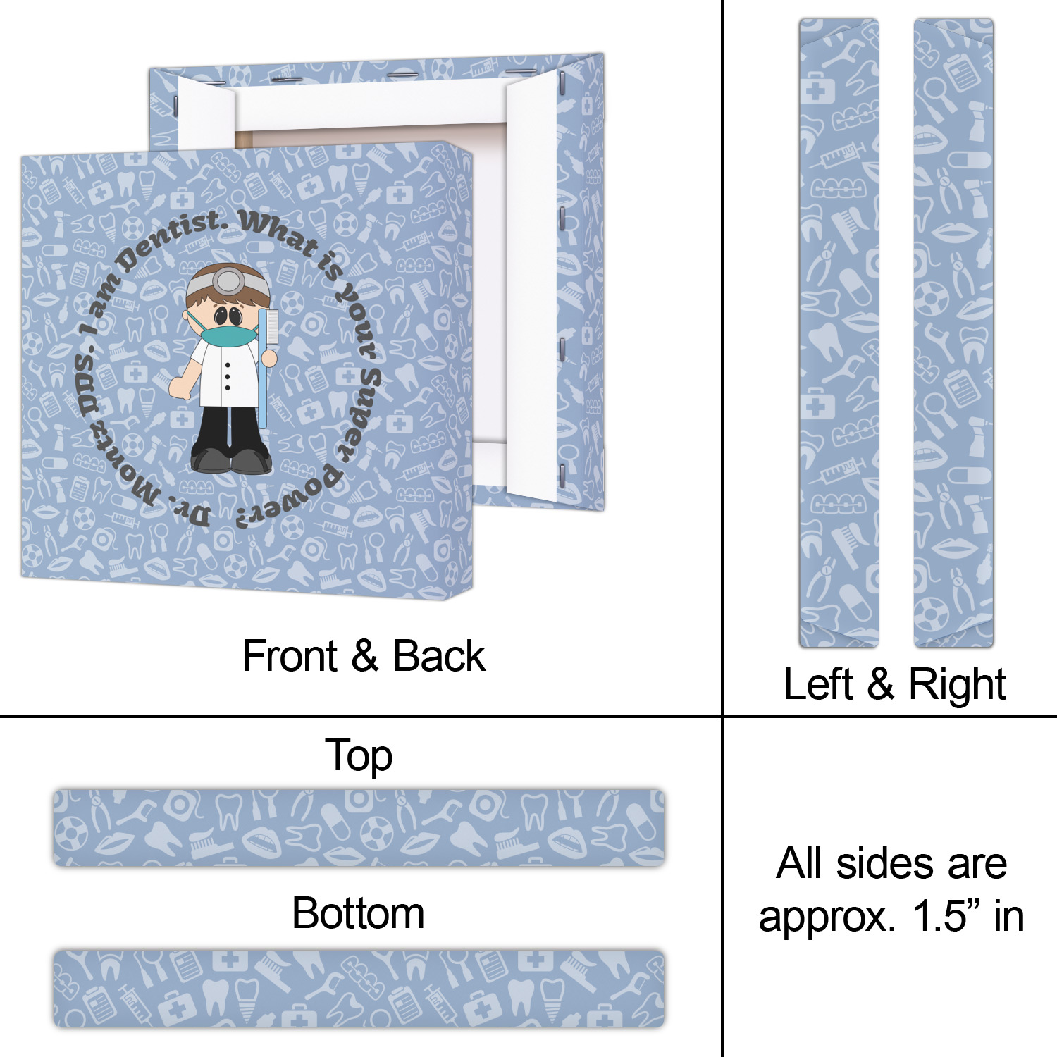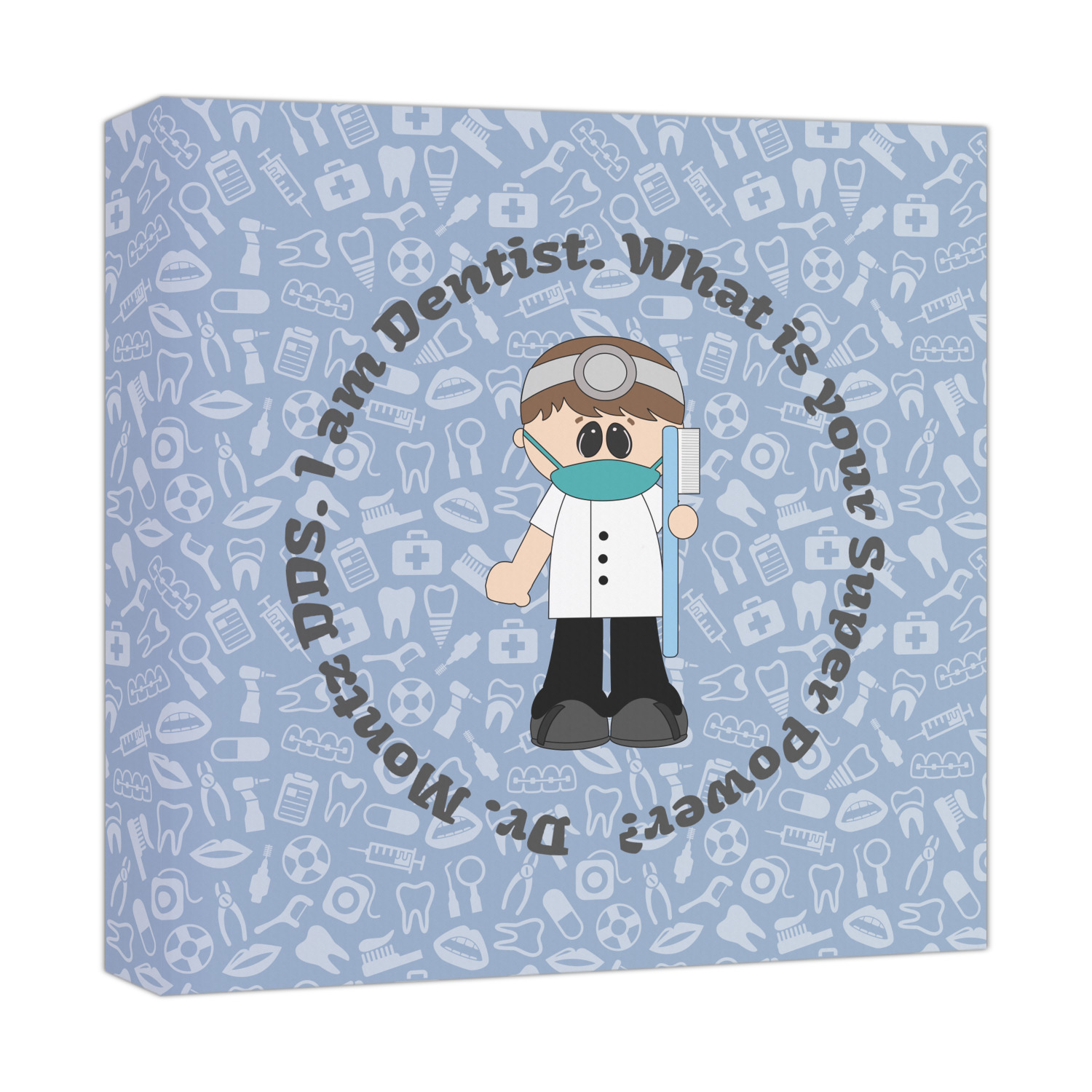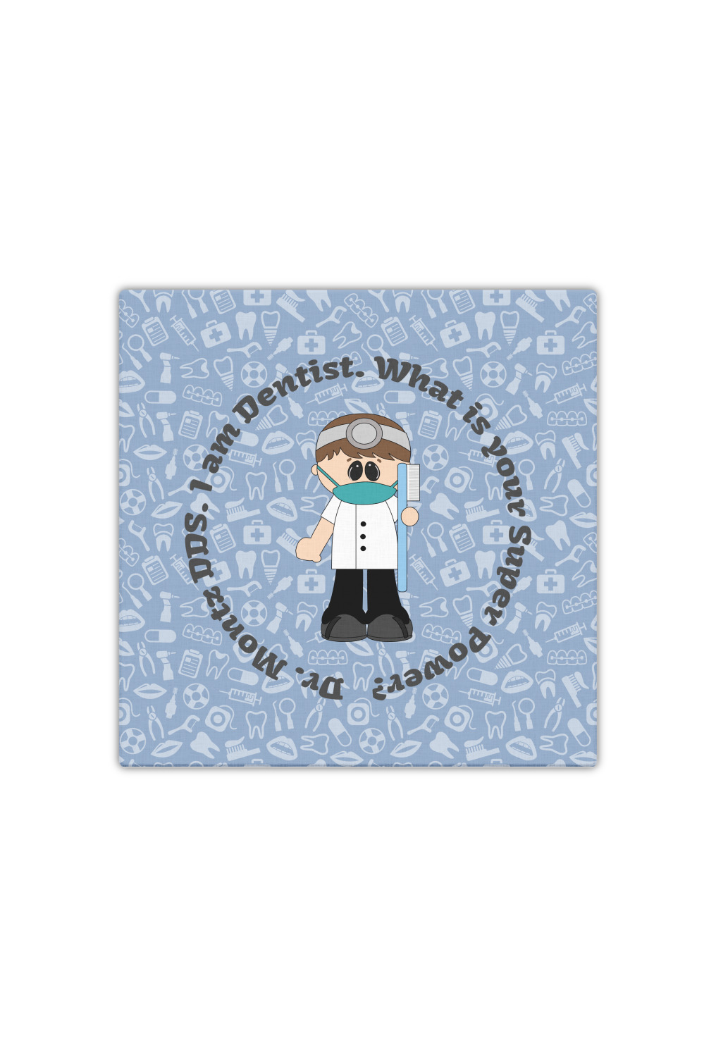 This design is a light blue with dark blue accents in its background. The design features a fun little cartoon dentist that will just make you smile. The text surrounding the little dentist will be the perfect place for a dentist pun or your name!