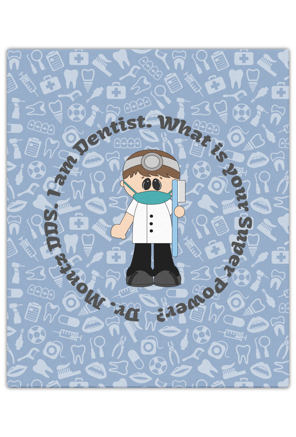 This design is a light blue with dark blue accents in its background. The design features a fun little cartoon dentist that will just make you smile. The text surrounding the little dentist will be the perfect place for a dentist pun or your name!