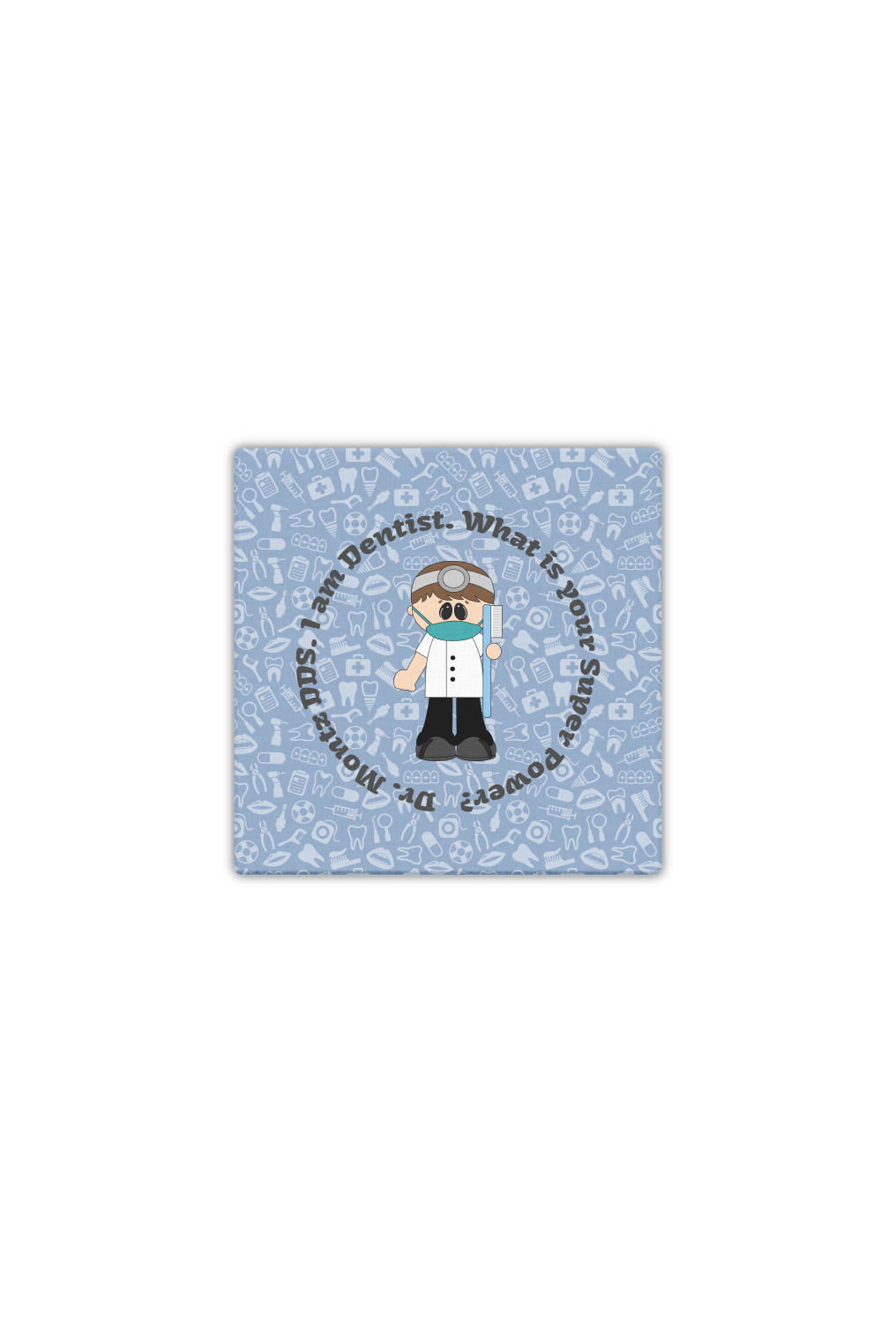 This design is a light blue with dark blue accents in its background. The design features a fun little cartoon dentist that will just make you smile. The text surrounding the little dentist will be the perfect place for a dentist pun or your name!