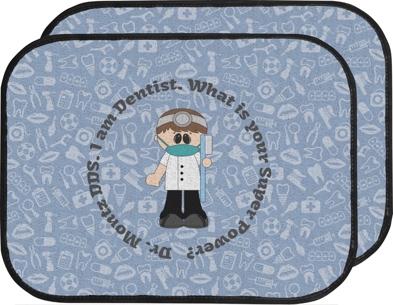 This design is a light blue with dark blue accents in its background. The design features a fun little cartoon dentist that will just make you smile. The text surrounding the little dentist will be the perfect place for a dentist pun or your name!