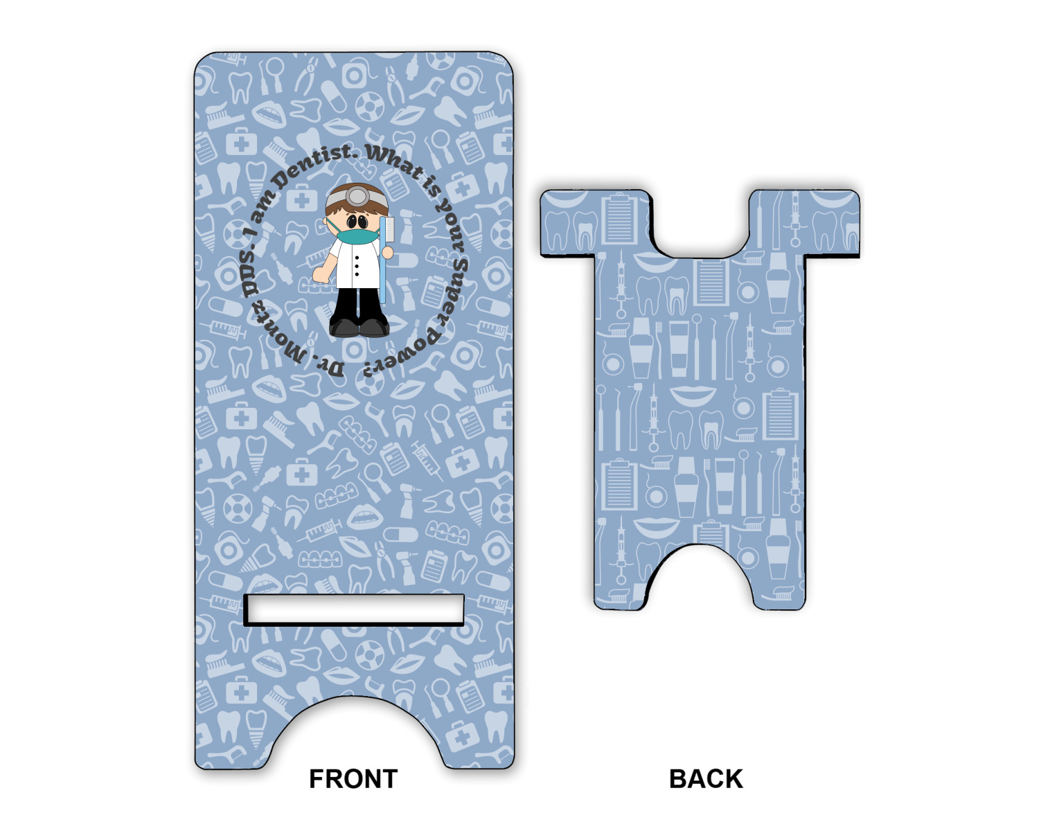 This design is a light blue with dark blue accents in its background. The design features a fun little cartoon dentist that will just make you smile. The text surrounding the little dentist will be the perfect place for a dentist pun or your name!