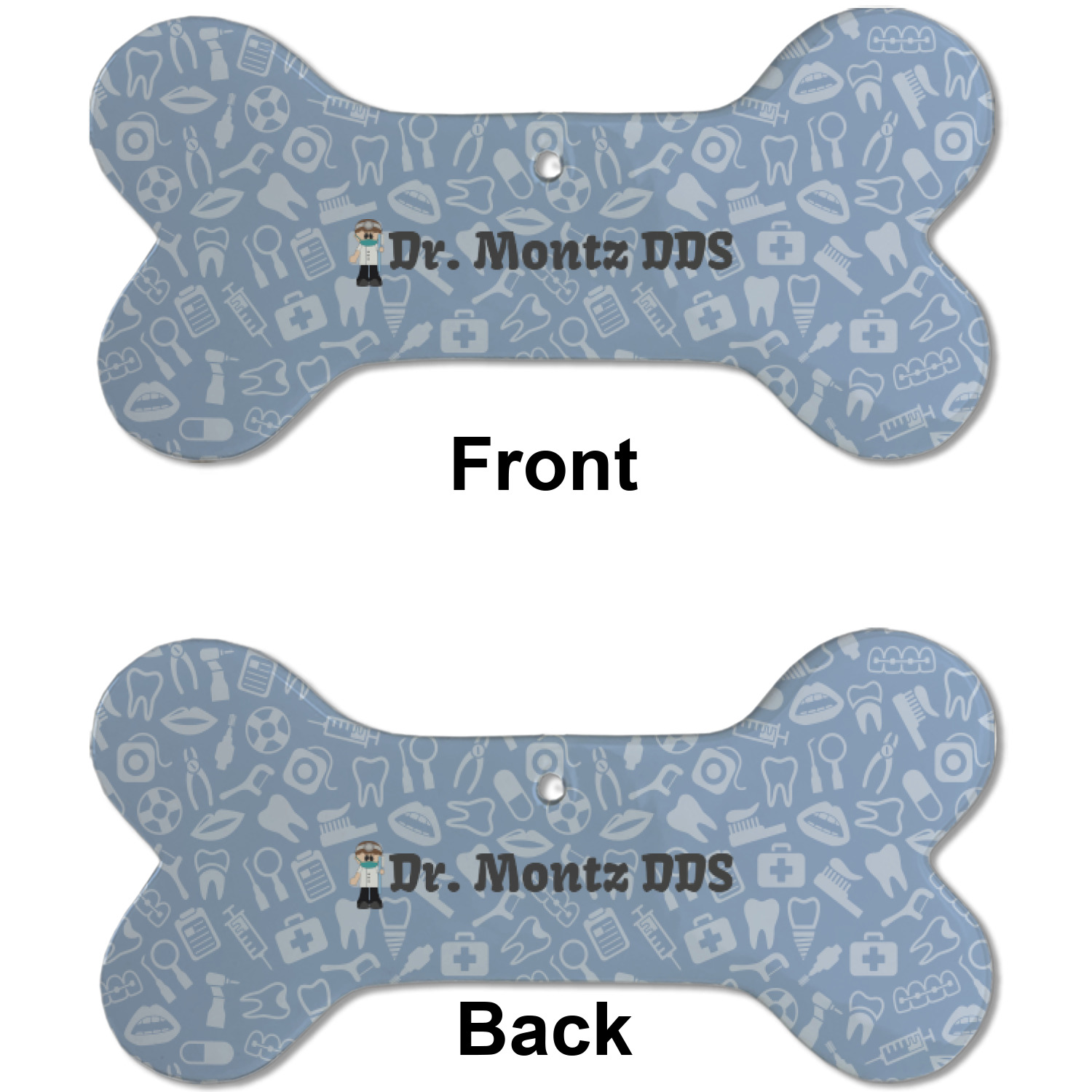 This design is a light blue with dark blue accents in its background. The design features a fun little cartoon dentist that will just make you smile. The text surrounding the little dentist will be the perfect place for a dentist pun or your name!