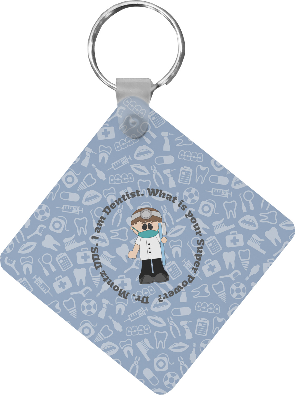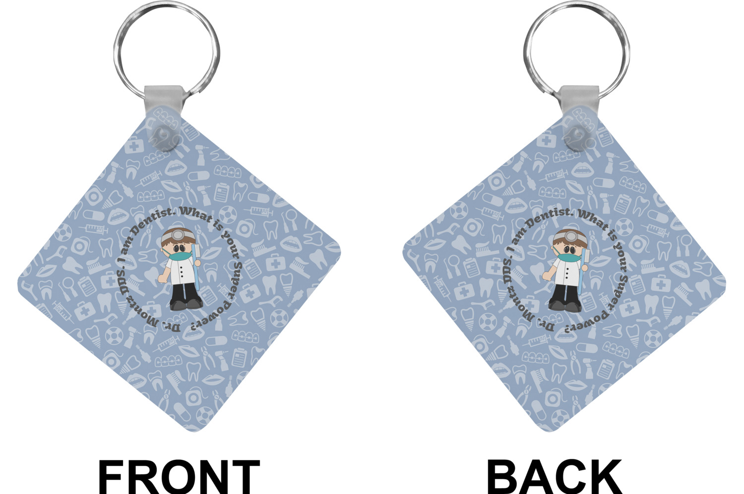 This design is a light blue with dark blue accents in its background. The design features a fun little cartoon dentist that will just make you smile. The text surrounding the little dentist will be the perfect place for a dentist pun or your name!