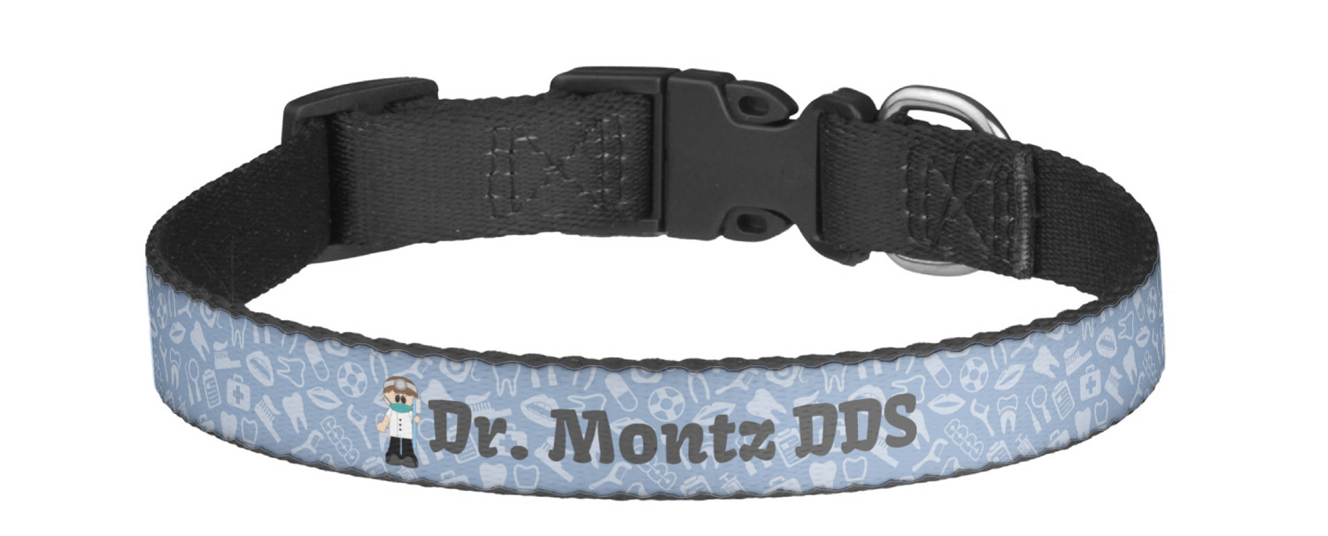This sturdy collar, made from a durable nylon weave, will outlive your dog's episodes of excited tugging and pulling. Courtesy of its thick plastic buckle and adjuster, this collar is adjustable and accommodating of any dog. Structurally, the collar is a single piece of nylon weave that is sewn together, and features a solid metal loop where you can attach a leash or dog tag. We print and display your dog's name and pattern across the middle of the personalized dog collar.