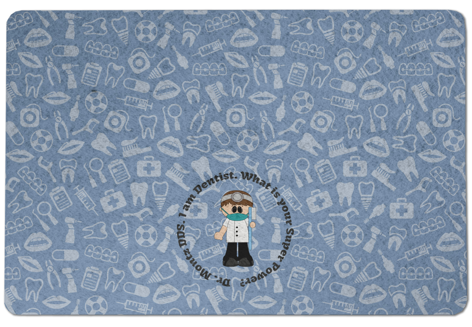 This design is a light blue with dark blue accents in its background. The design features a fun little cartoon dentist that will just make you smile. The text surrounding the little dentist will be the perfect place for a dentist pun or your name!