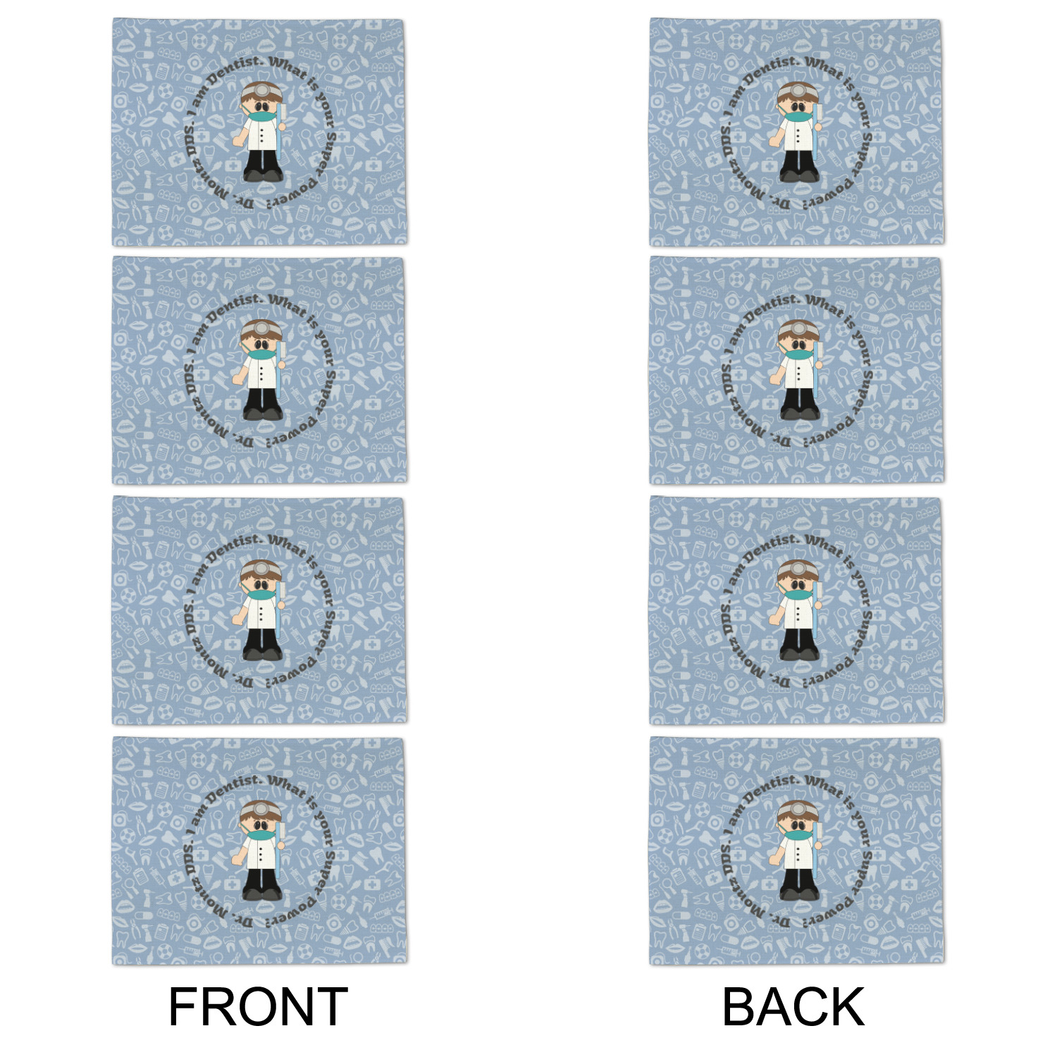 This design is a light blue with dark blue accents in its background. The design features a fun little cartoon dentist that will just make you smile. The text surrounding the little dentist will be the perfect place for a dentist pun or your name!