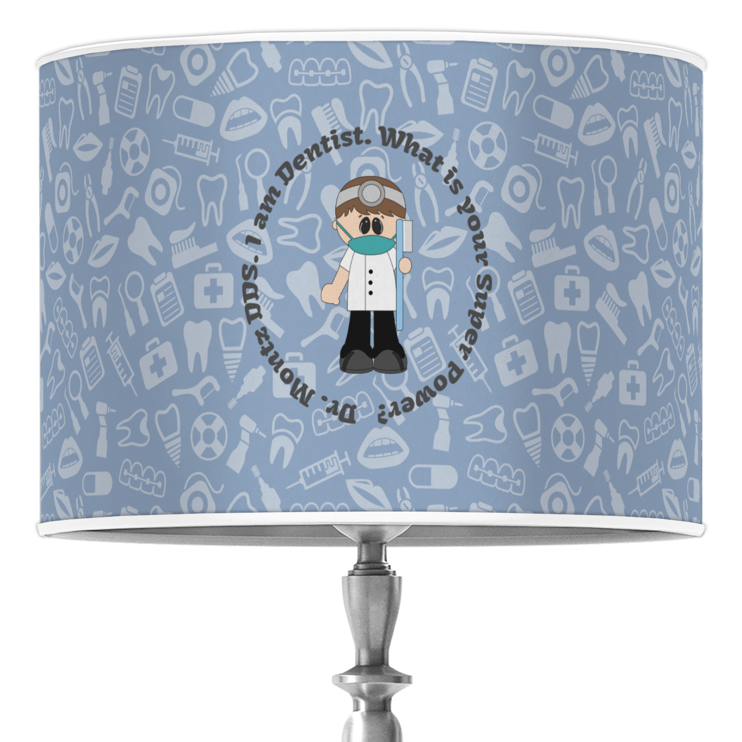 This design is a light blue with dark blue accents in its background. The design features a fun little cartoon dentist that will just make you smile. The text surrounding the little dentist will be the perfect place for a dentist pun or your name!