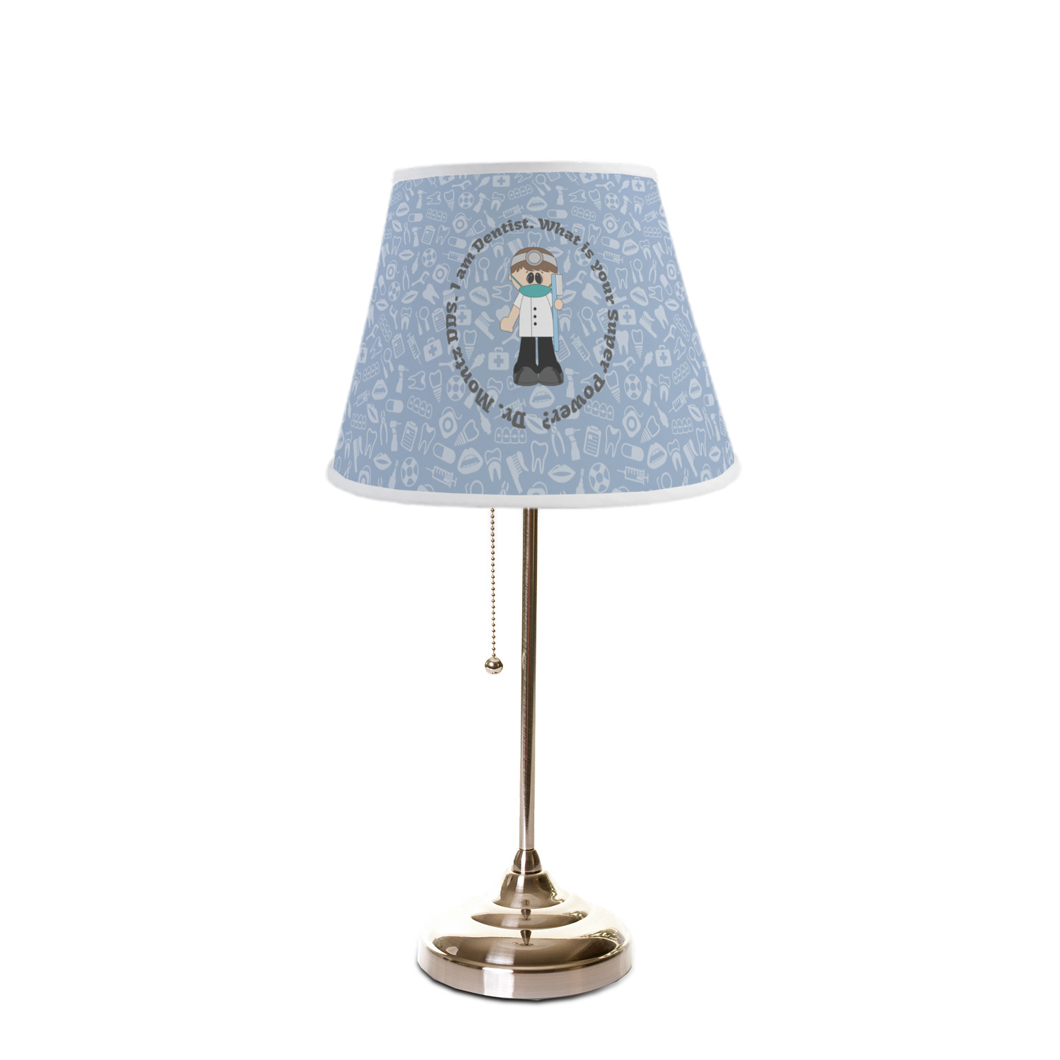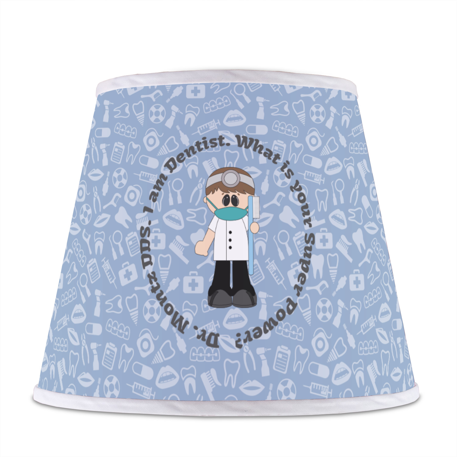 This design is a light blue with dark blue accents in its background. The design features a fun little cartoon dentist that will just make you smile. The text surrounding the little dentist will be the perfect place for a dentist pun or your name!