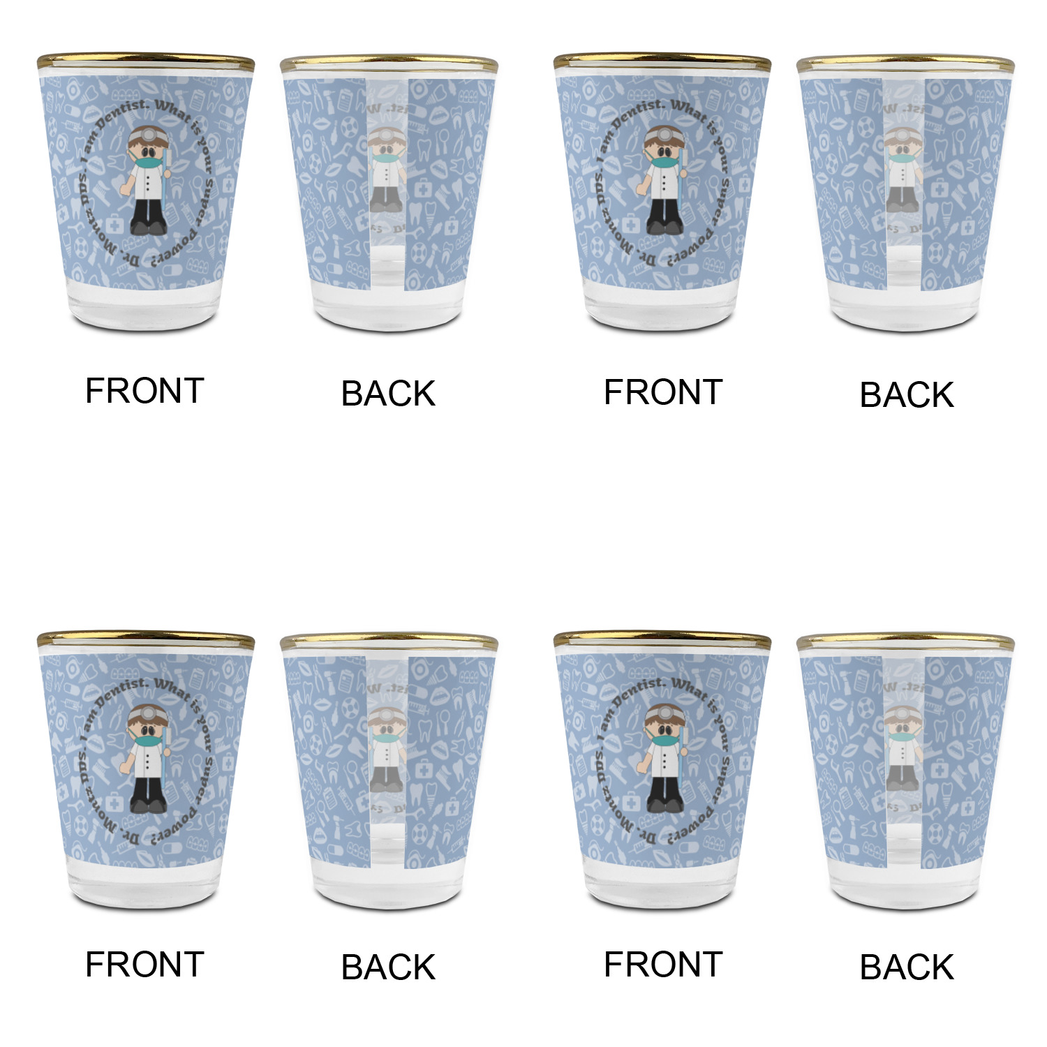 This design is a light blue with dark blue accents in its background. The design features a fun little cartoon dentist that will just make you smile. The text surrounding the little dentist will be the perfect place for a dentist pun or your name!