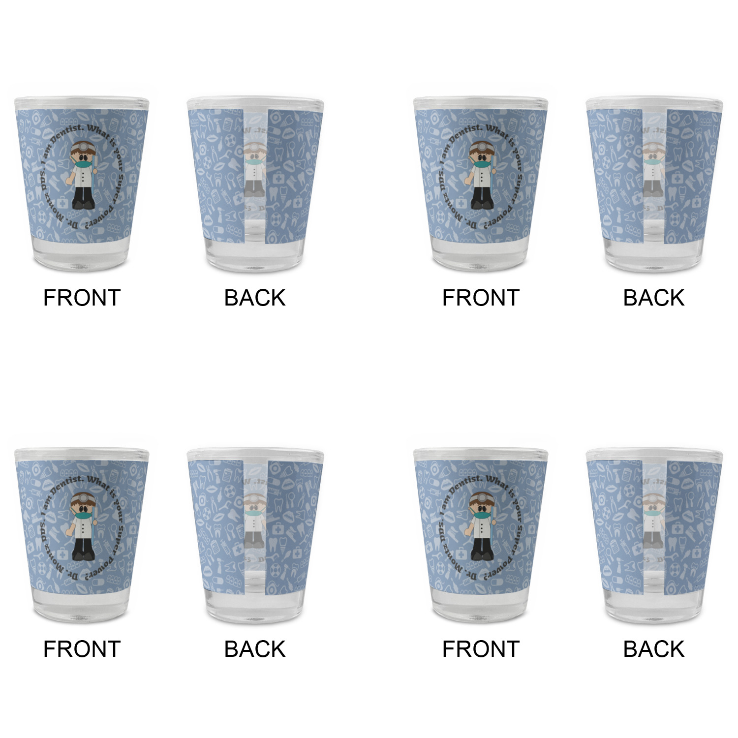 This design is a light blue with dark blue accents in its background. The design features a fun little cartoon dentist that will just make you smile. The text surrounding the little dentist will be the perfect place for a dentist pun or your name!