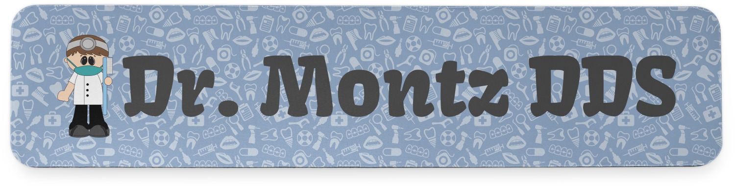 This design is a light blue with dark blue accents in its background. The design features a fun little cartoon dentist that will just make you smile. The text surrounding the little dentist will be the perfect place for a dentist pun or your name!
