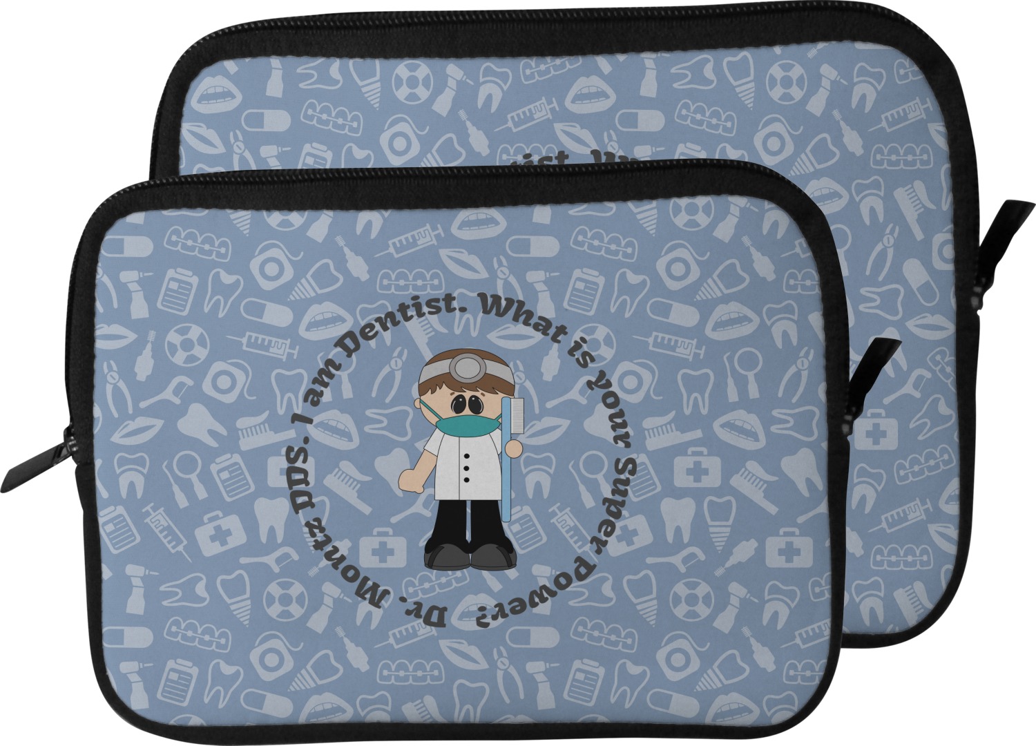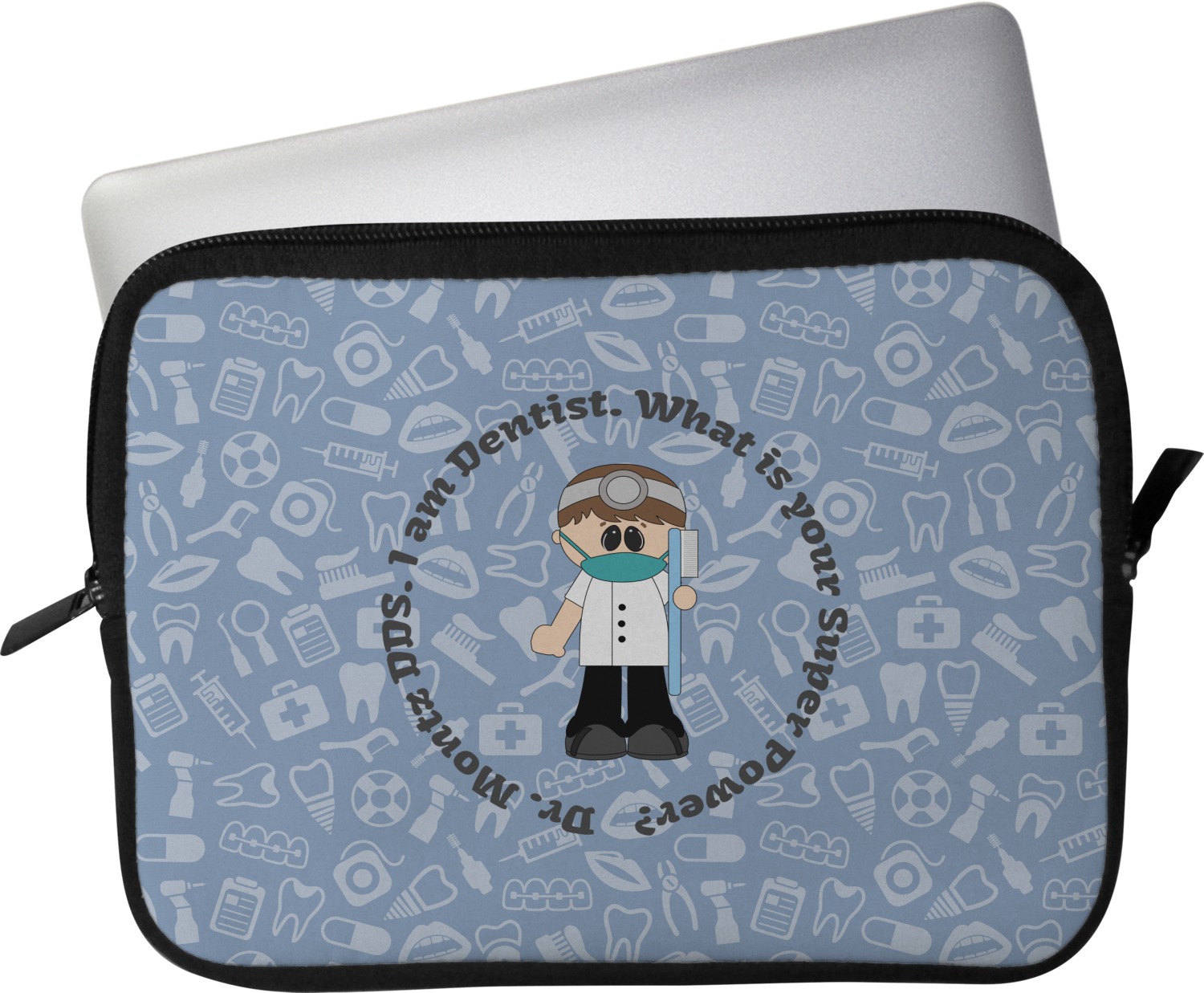 This design is a light blue with dark blue accents in its background. The design features a fun little cartoon dentist that will just make you smile. The text surrounding the little dentist will be the perfect place for a dentist pun or your name!