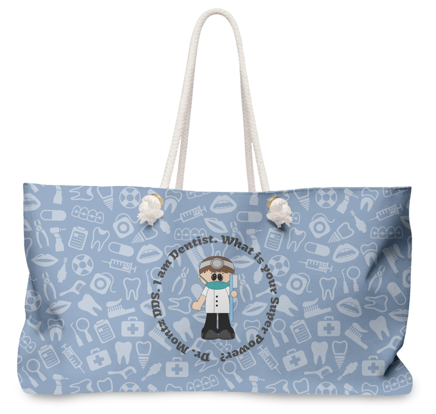 Our oversized weekender tote with rope handles is perfect for your weekend at the beach or on the town. This large tote are 24" W X 13" H, with a 5" gusset and a 27" thick rope handles with a knot that is put through a grommeted brass hole.