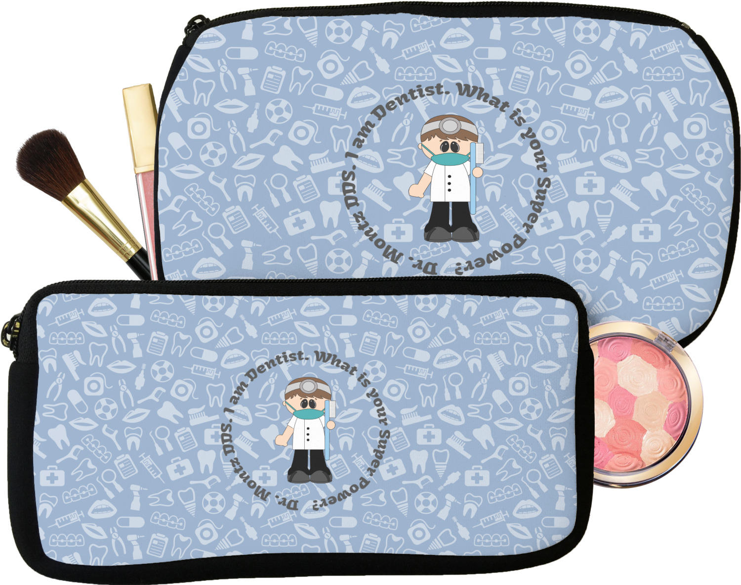 Our personalized makeup bags are available in many different designs, patterns and colors - so you are sure to find one that will love. They are made of neoprene (same material as wet-suits) and thus are water resistant, so spillages in your makeup bag will not end up all over you purse. They are customized on one side and are black on the other side and the zipper is black as well.