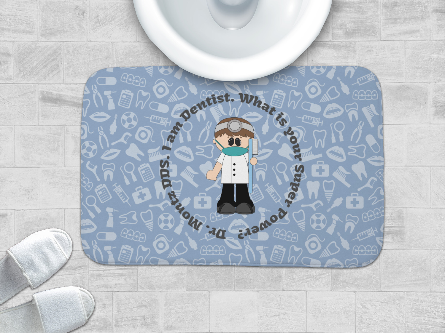 This design is a light blue with dark blue accents in its background. The design features a fun little cartoon dentist that will just make you smile. The text surrounding the little dentist will be the perfect place for a dentist pun or your name!