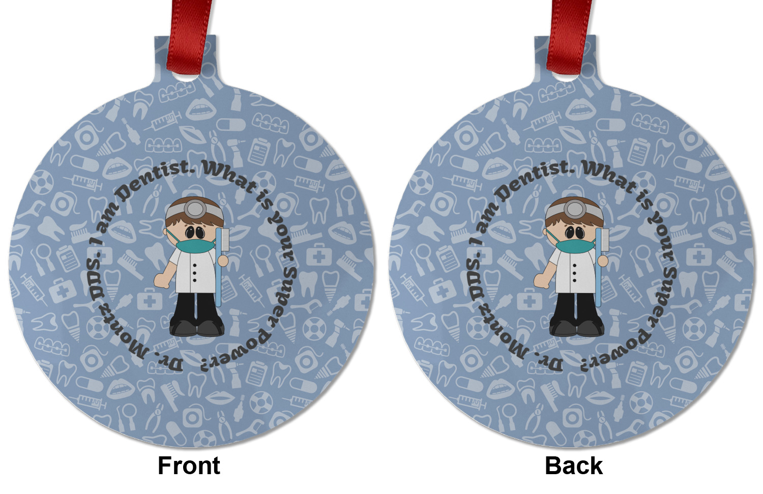 This design is a light blue with dark blue accents in its background. The design features a fun little cartoon dentist that will just make you smile. The text surrounding the little dentist will be the perfect place for a dentist pun or your name!