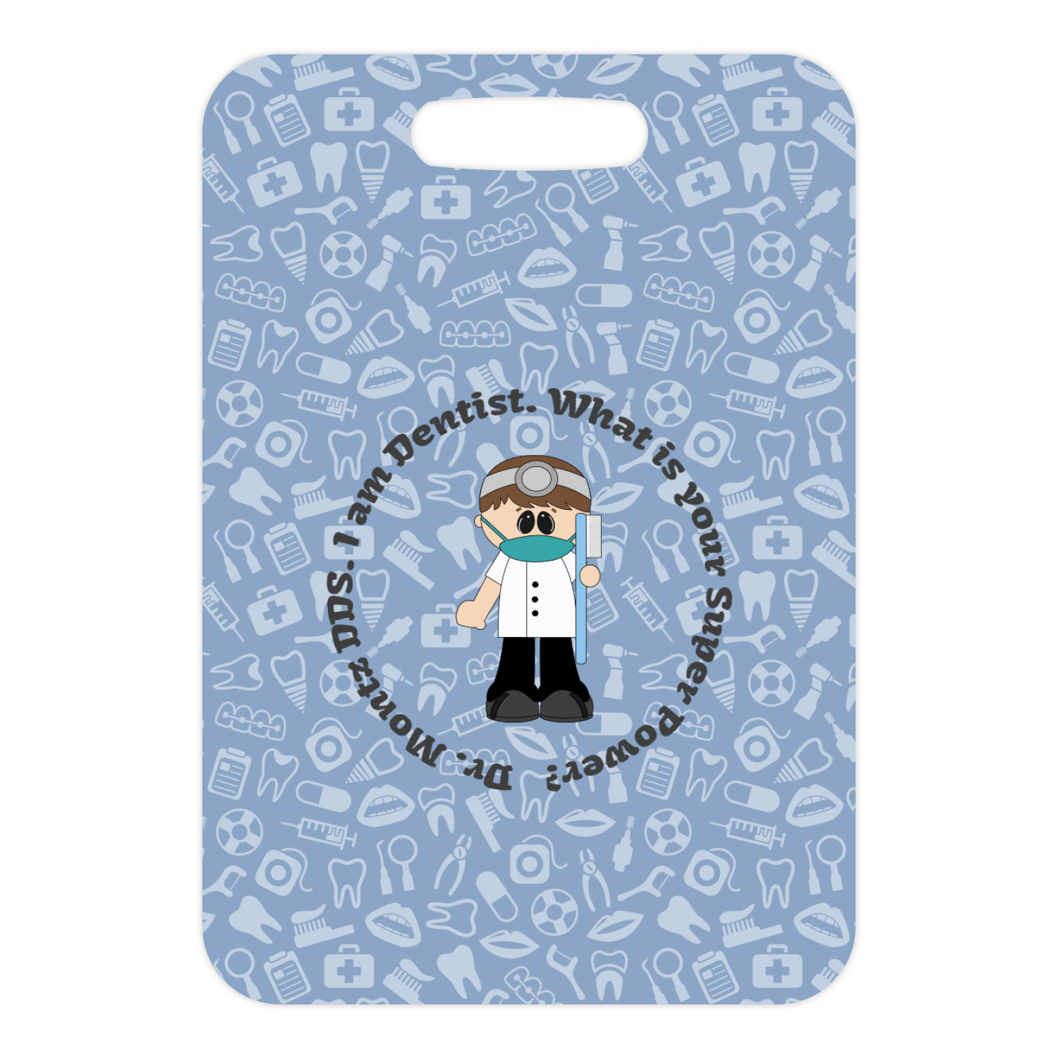 This design is a light blue with dark blue accents in its background. The design features a fun little cartoon dentist that will just make you smile. The text surrounding the little dentist will be the perfect place for a dentist pun or your name!