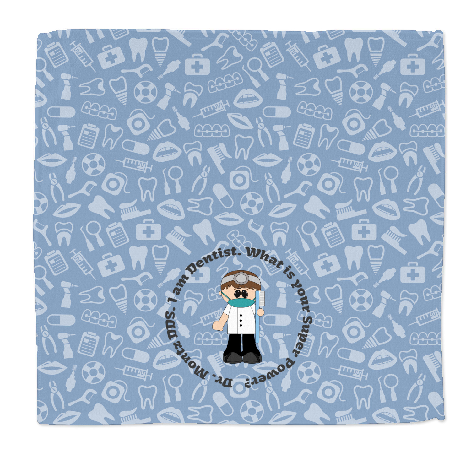 This design is a light blue with dark blue accents in its background. The design features a fun little cartoon dentist that will just make you smile. The text surrounding the little dentist will be the perfect place for a dentist pun or your name!