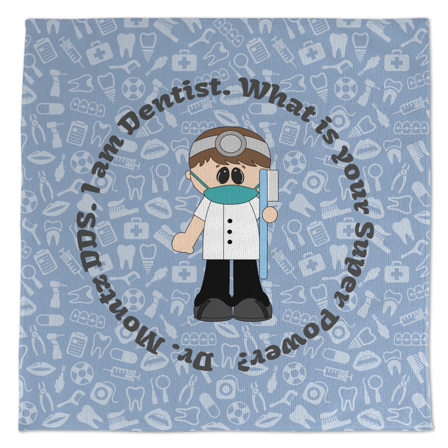 This design is a light blue with dark blue accents in its background. The design features a fun little cartoon dentist that will just make you smile. The text surrounding the little dentist will be the perfect place for a dentist pun or your name!
