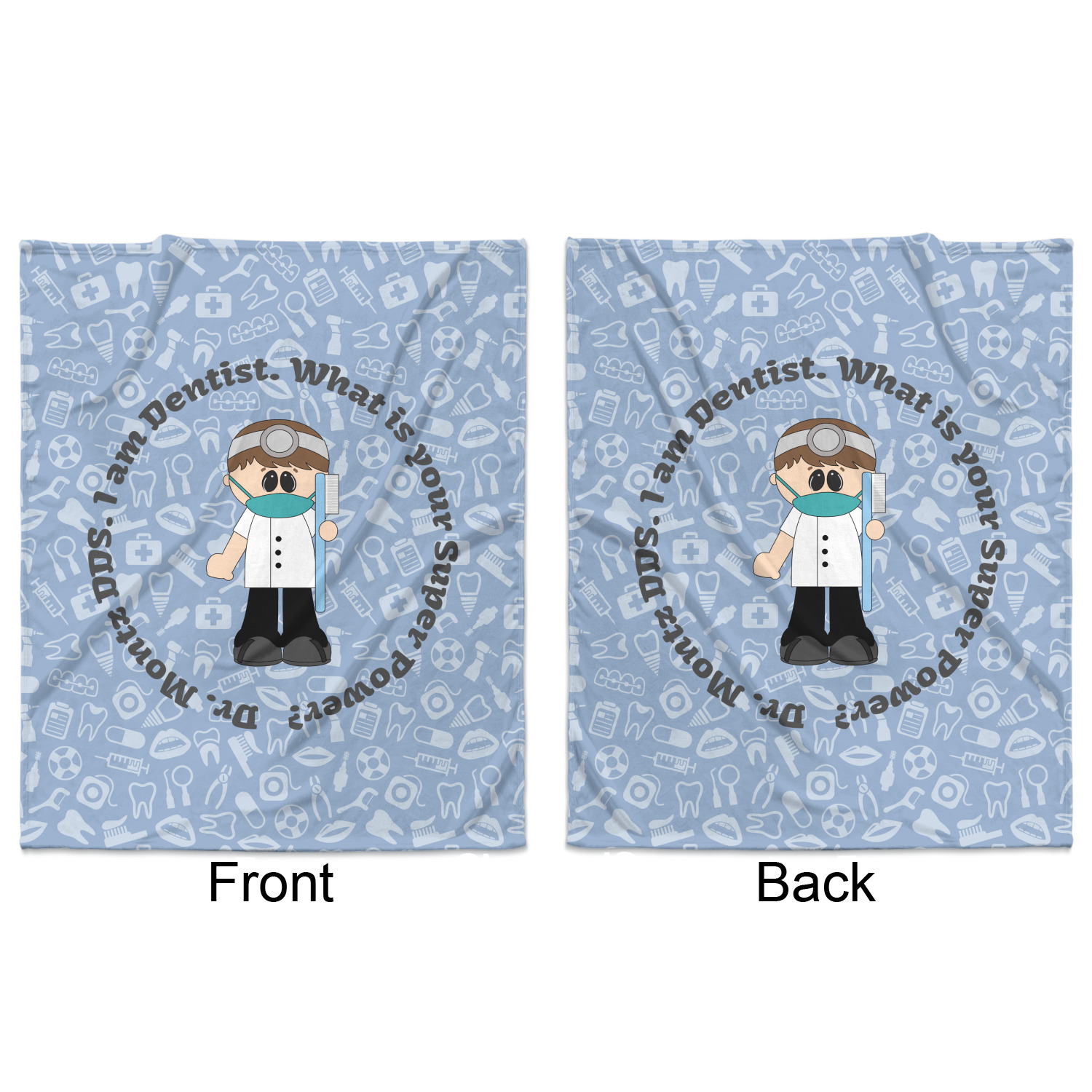 This design is a light blue with dark blue accents in its background. The design features a fun little cartoon dentist that will just make you smile. The text surrounding the little dentist will be the perfect place for a dentist pun or your name!