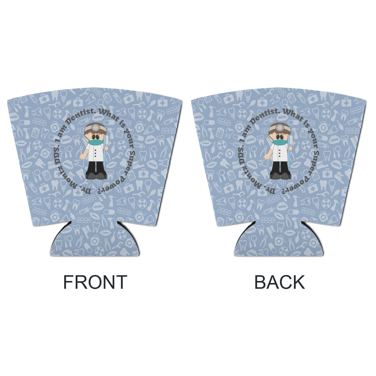 This design is a light blue with dark blue accents in its background. The design features a fun little cartoon dentist that will just make you smile. The text surrounding the little dentist will be the perfect place for a dentist pun or your name!