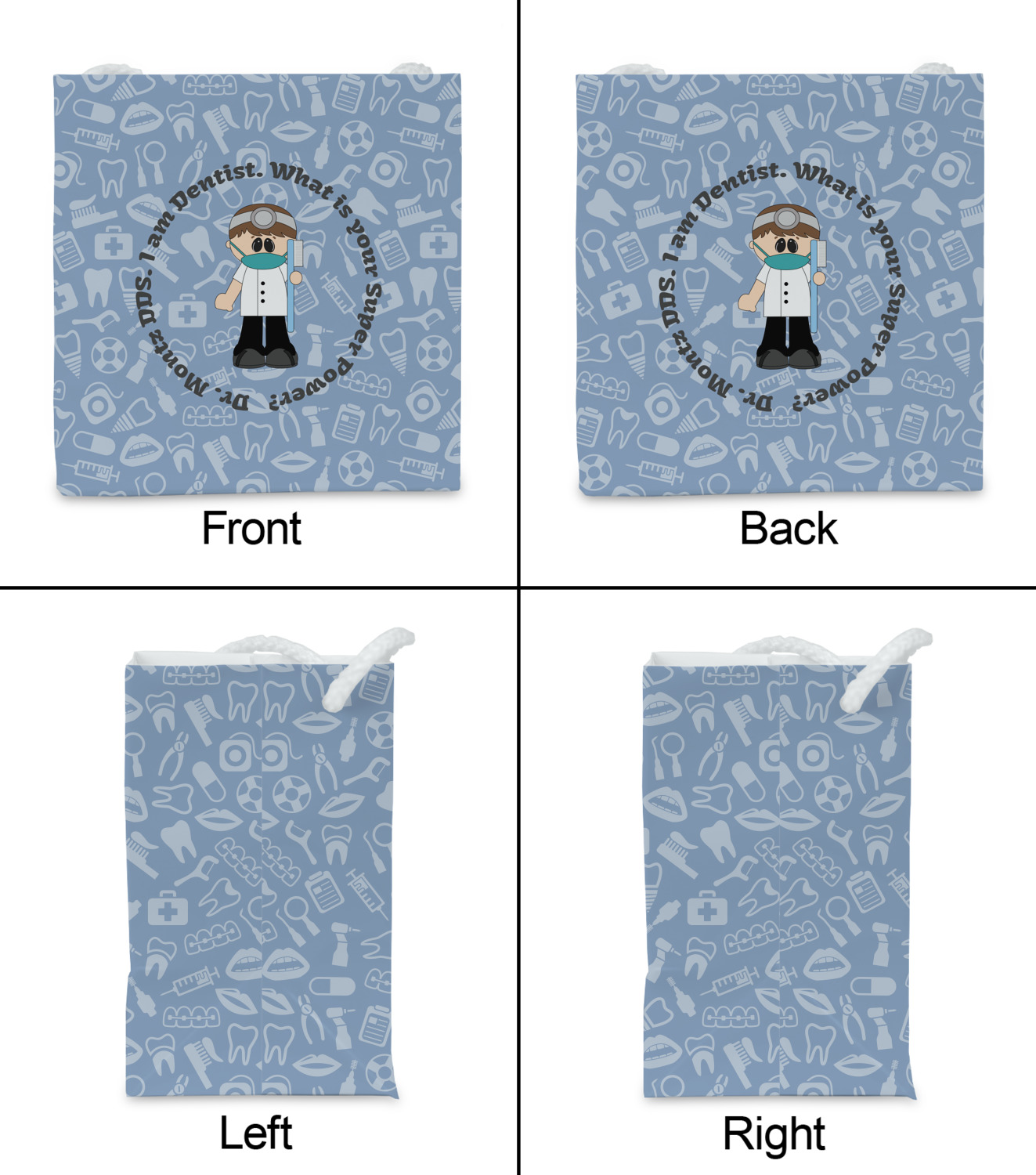 This design is a light blue with dark blue accents in its background. The design features a fun little cartoon dentist that will just make you smile. The text surrounding the little dentist will be the perfect place for a dentist pun or your name!