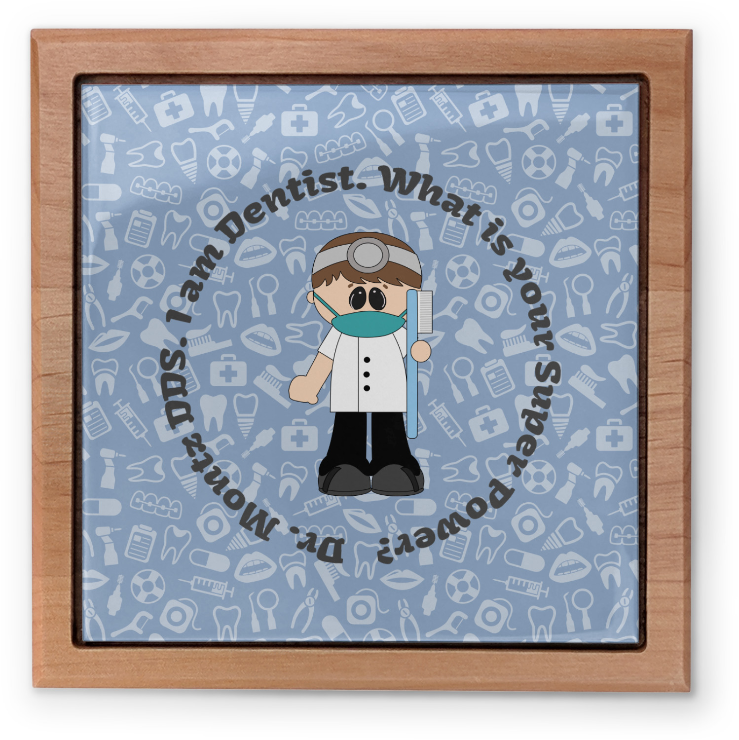 This design is a light blue with dark blue accents in its background. The design features a fun little cartoon dentist that will just make you smile. The text surrounding the little dentist will be the perfect place for a dentist pun or your name!