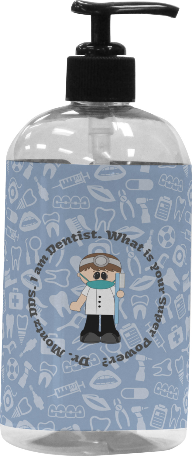 This design is a light blue with dark blue accents in its background. The design features a fun little cartoon dentist that will just make you smile. The text surrounding the little dentist will be the perfect place for a dentist pun or your name!
