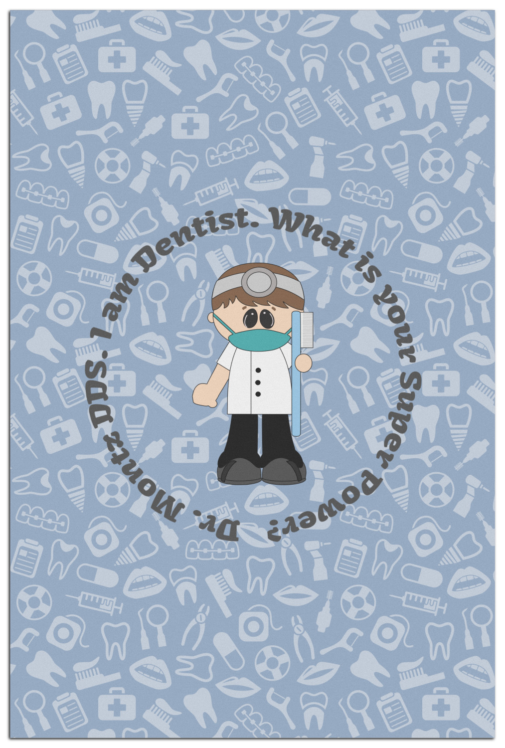 This design is a light blue with dark blue accents in its background. The design features a fun little cartoon dentist that will just make you smile. The text surrounding the little dentist will be the perfect place for a dentist pun or your name!