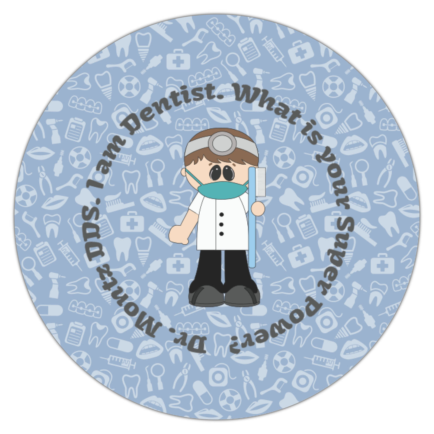 This design is a light blue with dark blue accents in its background. The design features a fun little cartoon dentist that will just make you smile. The text surrounding the little dentist will be the perfect place for a dentist pun or your name!