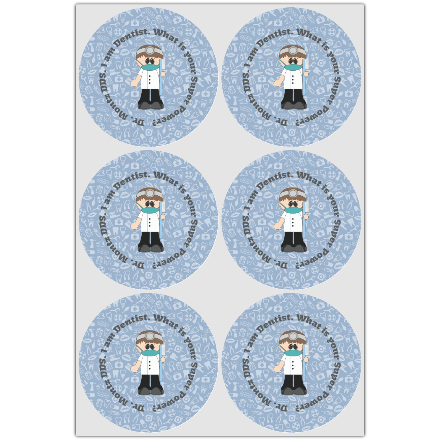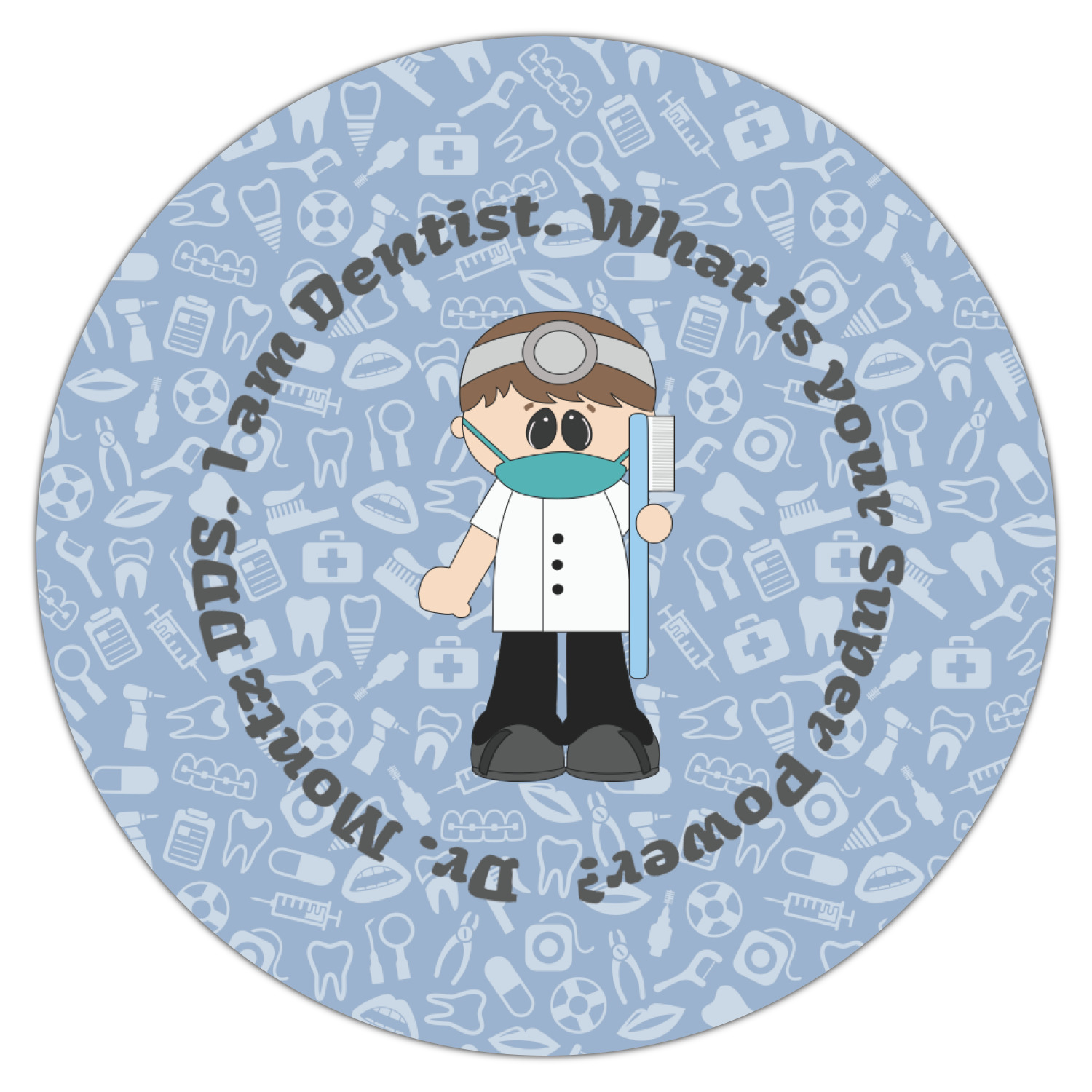 This design is a light blue with dark blue accents in its background. The design features a fun little cartoon dentist that will just make you smile. The text surrounding the little dentist will be the perfect place for a dentist pun or your name!