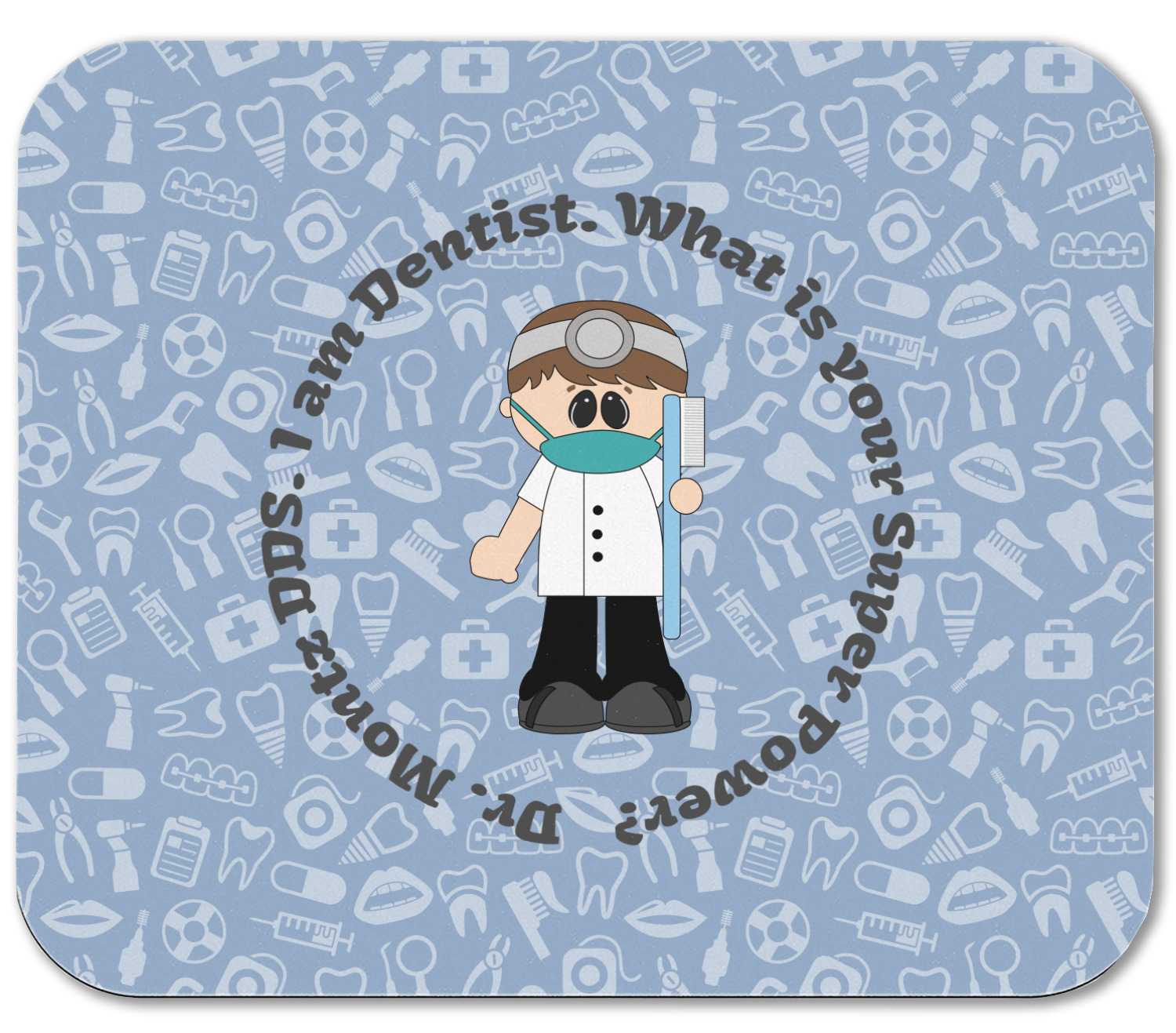 This design is a light blue with dark blue accents in its background. The design features a fun little cartoon dentist that will just make you smile. The text surrounding the little dentist will be the perfect place for a dentist pun or your name!