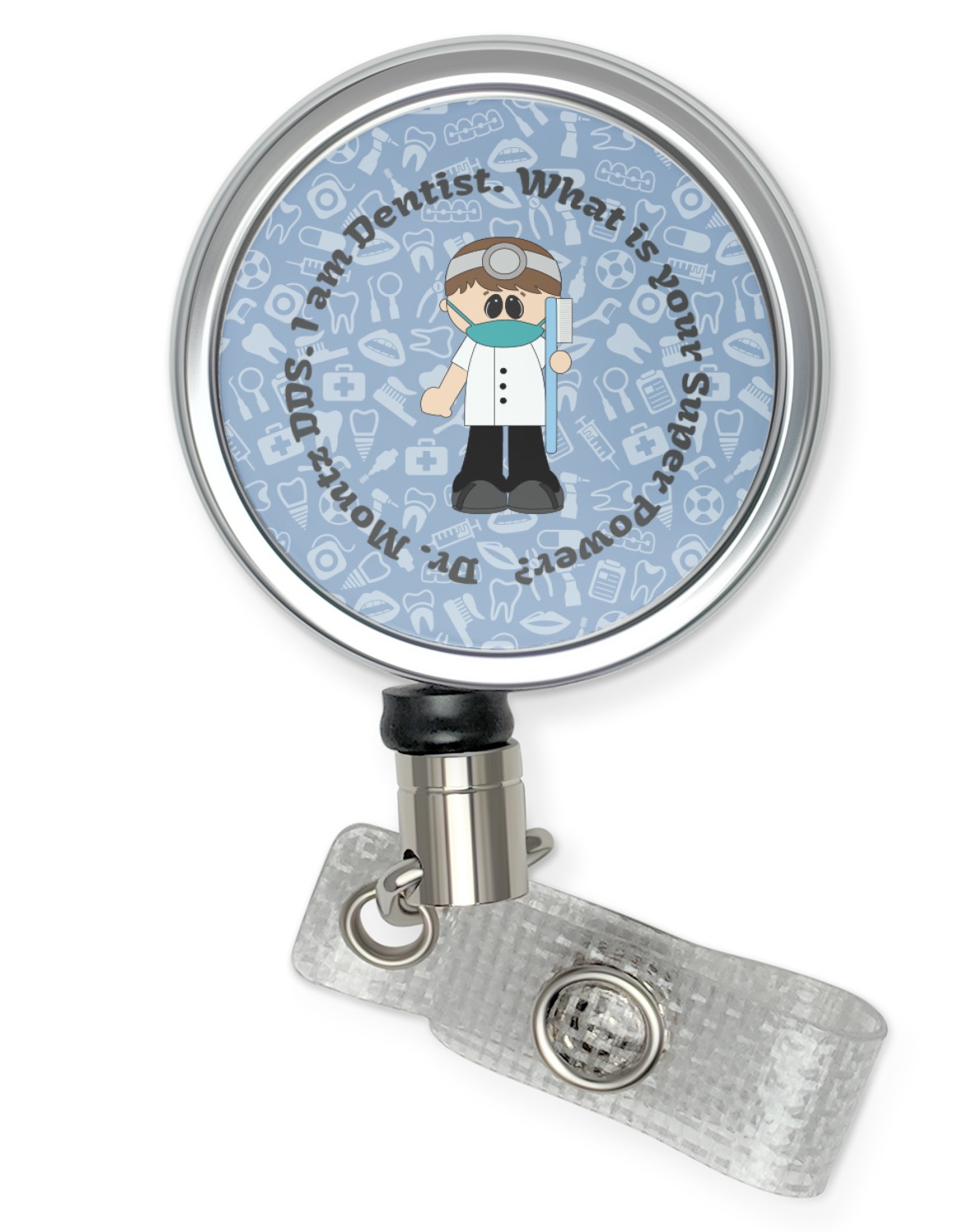 This design is a light blue with dark blue accents in its background. The design features a fun little cartoon dentist that will just make you smile. The text surrounding the little dentist will be the perfect place for a dentist pun or your name!