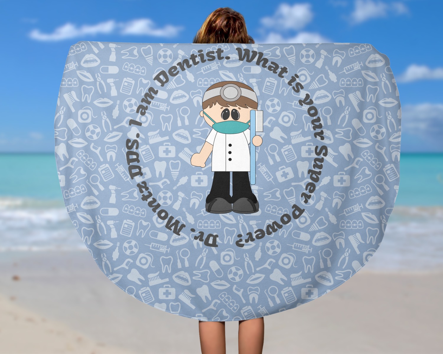 This design is a light blue with dark blue accents in its background. The design features a fun little cartoon dentist that will just make you smile. The text surrounding the little dentist will be the perfect place for a dentist pun or your name!