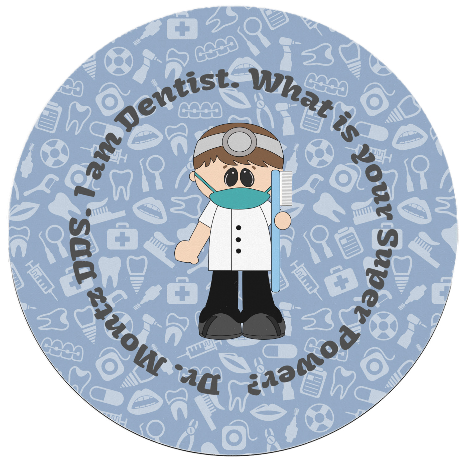 This design is a light blue with dark blue accents in its background. The design features a fun little cartoon dentist that will just make you smile. The text surrounding the little dentist will be the perfect place for a dentist pun or your name!
