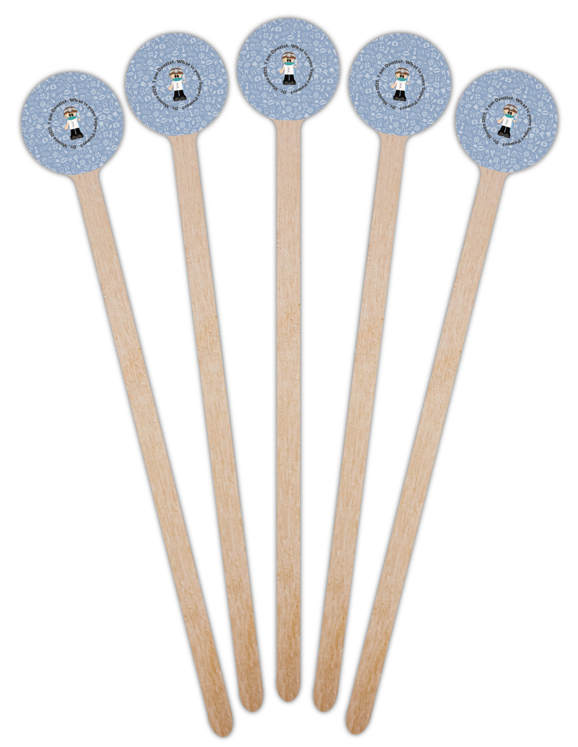 This design is a light blue with dark blue accents in its background. The design features a fun little cartoon dentist that will just make you smile. The text surrounding the little dentist will be the perfect place for a dentist pun or your name!