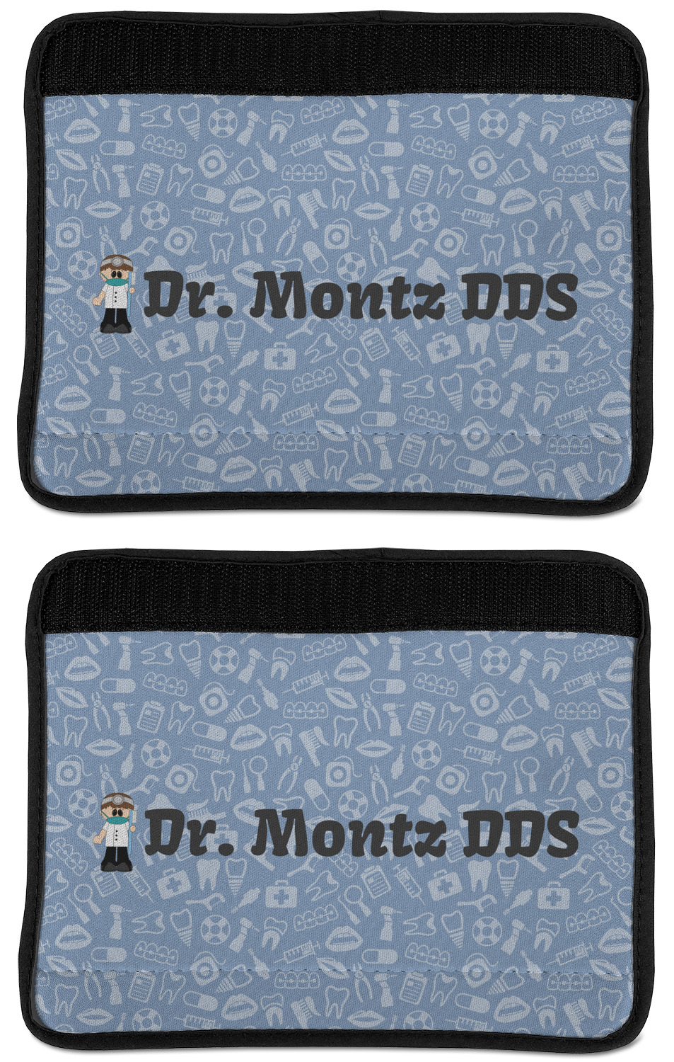 Made from neoprene, our seat belt strap covers wrap around the belt itself and have a Velcro tab for easy attachment and closure. The belt's edges are trimmed with a black polyester for a secure finish. Each cover is 9.5 by 7 inches when open and 9.5 by 2.5 inches when closed. We print your personalized design on the face of the seat belt pad.