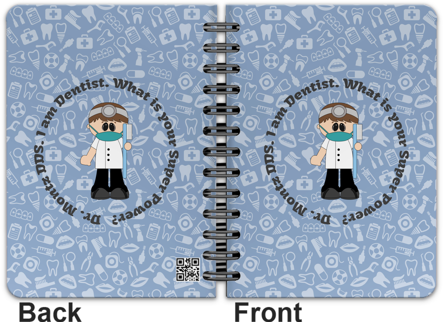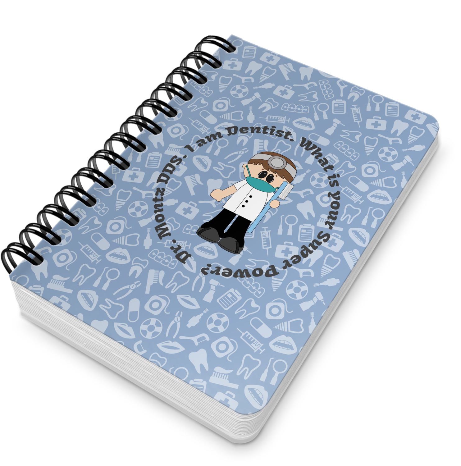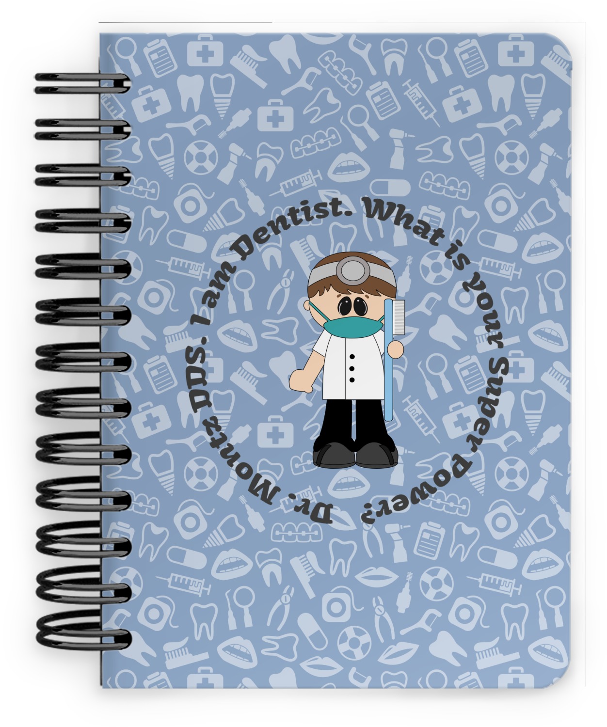 This design is a light blue with dark blue accents in its background. The design features a fun little cartoon dentist that will just make you smile. The text surrounding the little dentist will be the perfect place for a dentist pun or your name!