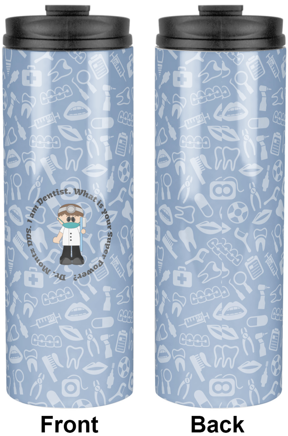 This design is a light blue with dark blue accents in its background. The design features a fun little cartoon dentist that will just make you smile. The text surrounding the little dentist will be the perfect place for a dentist pun or your name!