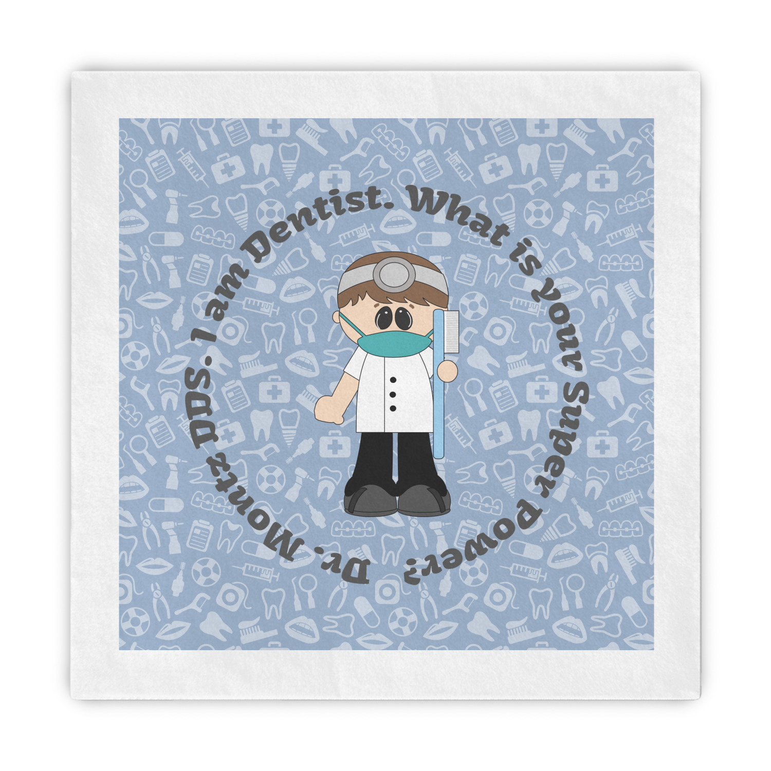 This design is a light blue with dark blue accents in its background. The design features a fun little cartoon dentist that will just make you smile. The text surrounding the little dentist will be the perfect place for a dentist pun or your name!